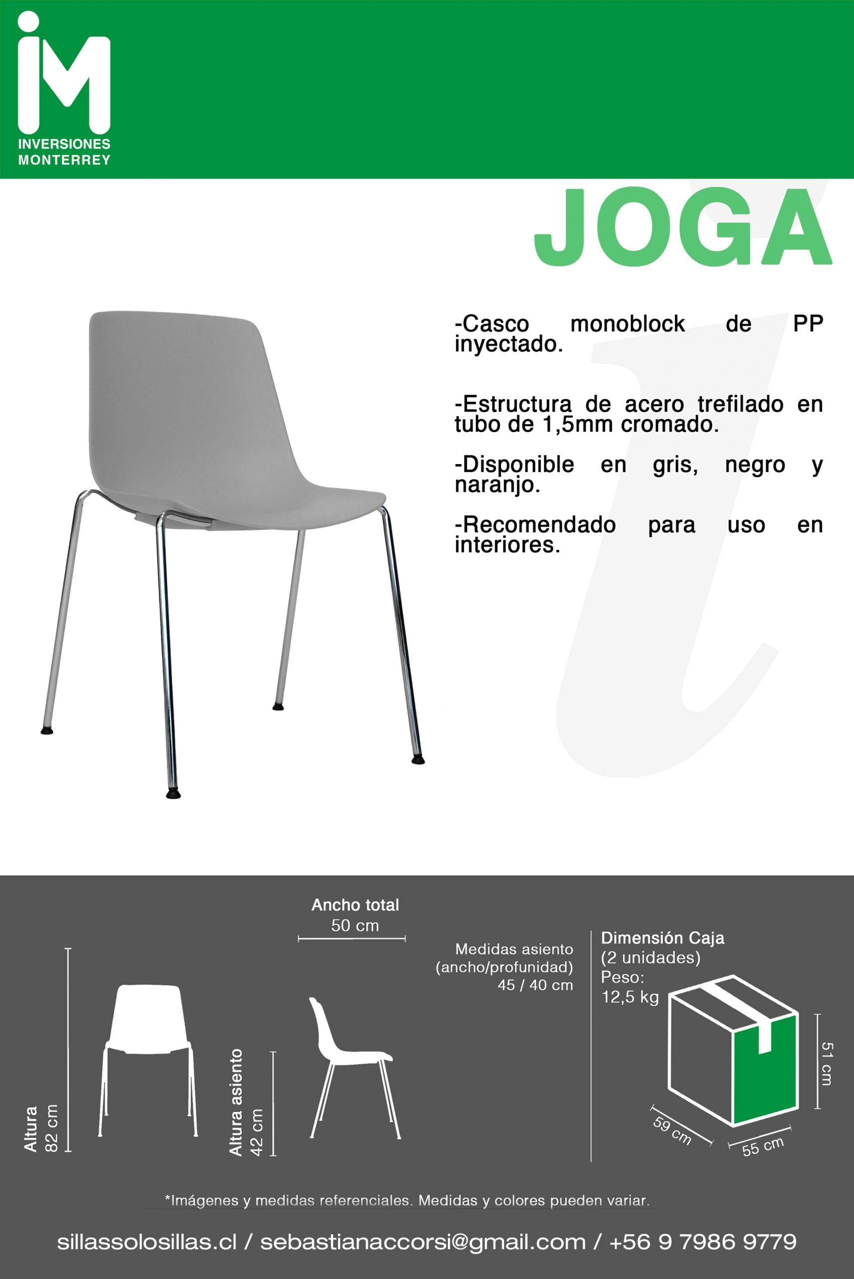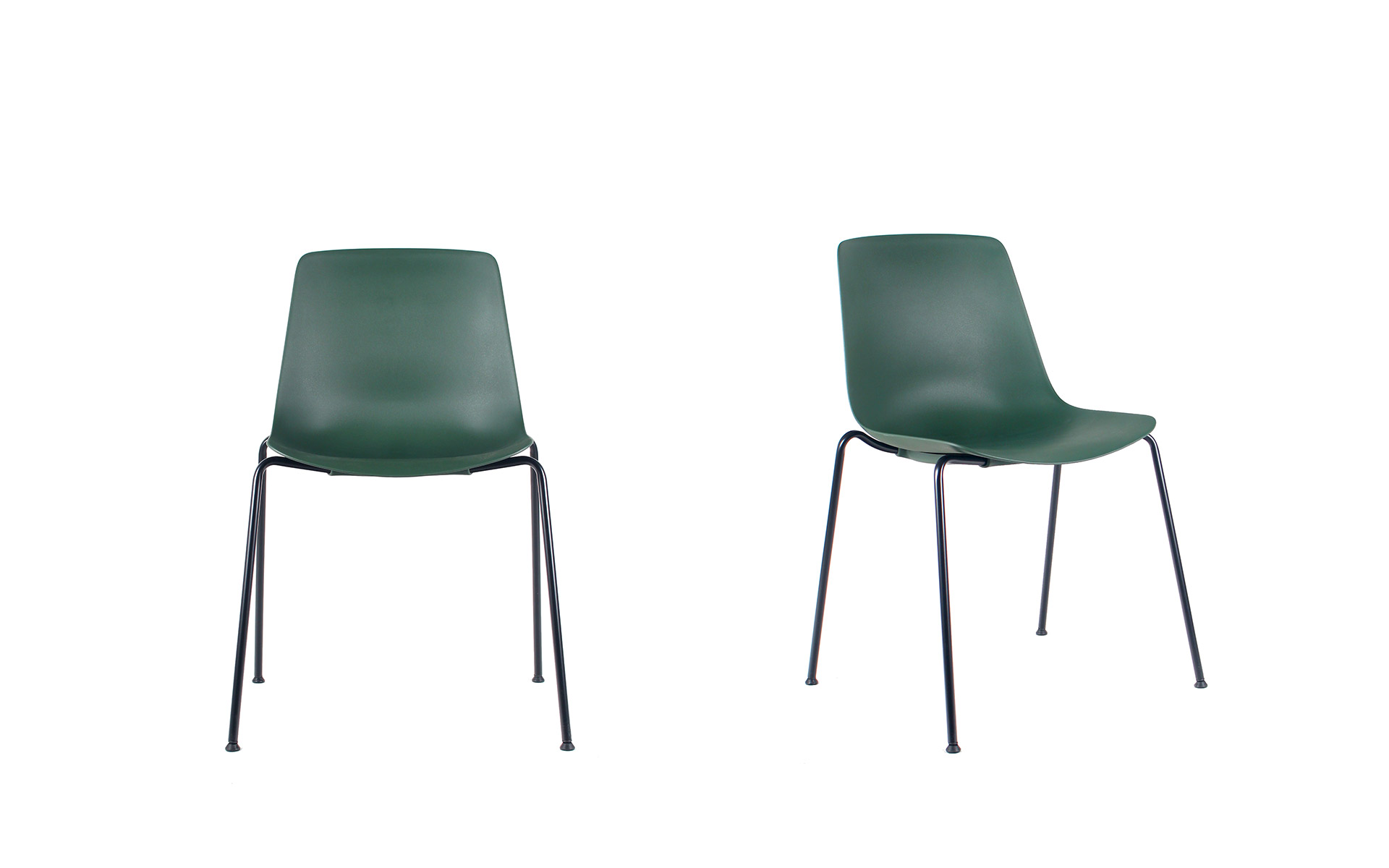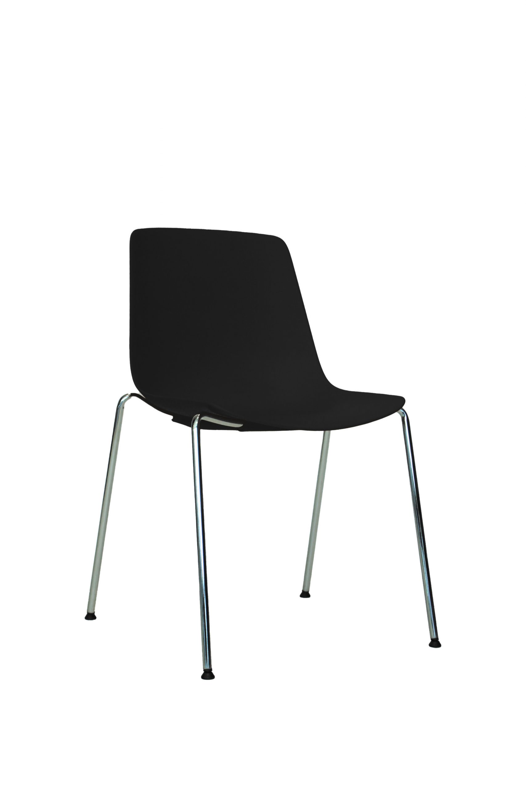 Respaldo y asiento casco de PP. El asiento tiene 45 cm de ancho y 43 cm de profundidad, el respaldo, 45 cm de ancho y 40 cm de alto. Estructura de 4 patas de acero cromado o pintado negro.