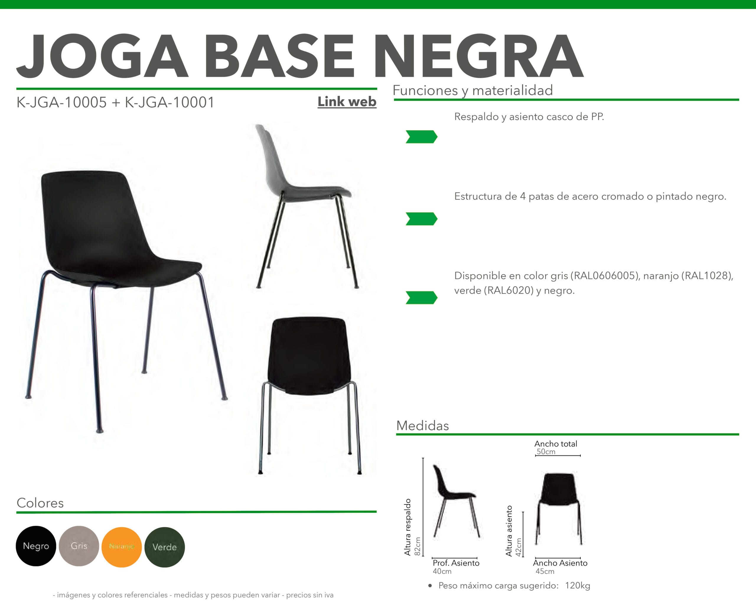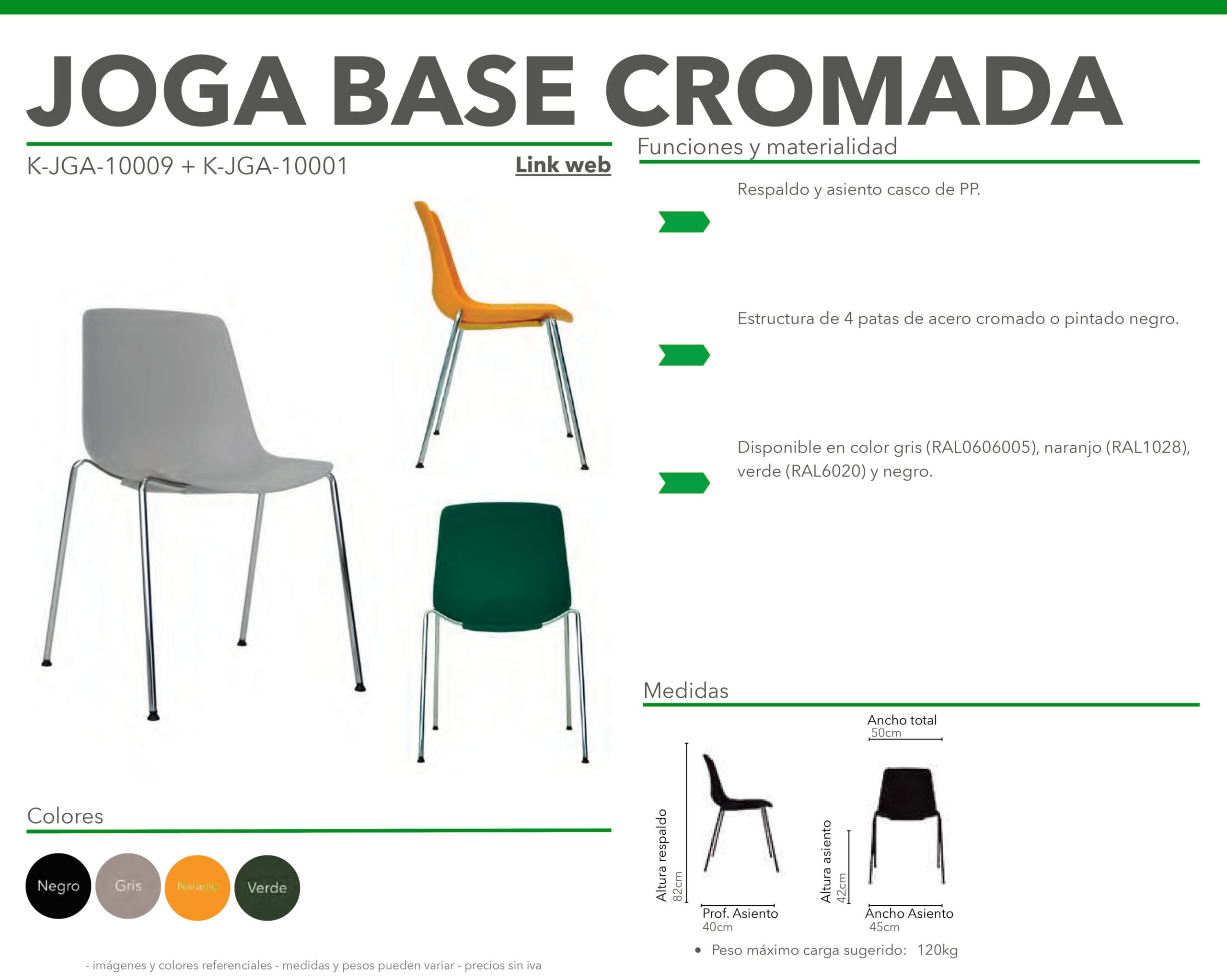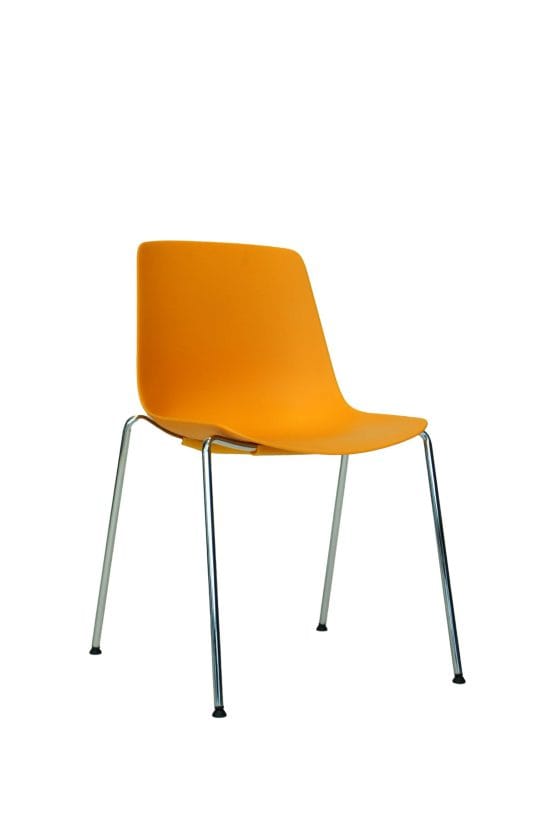 Respaldo y asiento casco de PP. El asiento tiene 45 cm de ancho y 43 cm de profundidad, el respaldo, 45 cm de ancho y 40 cm de alto.  Estructura de 4 patas de acero cromado o pintado negro.