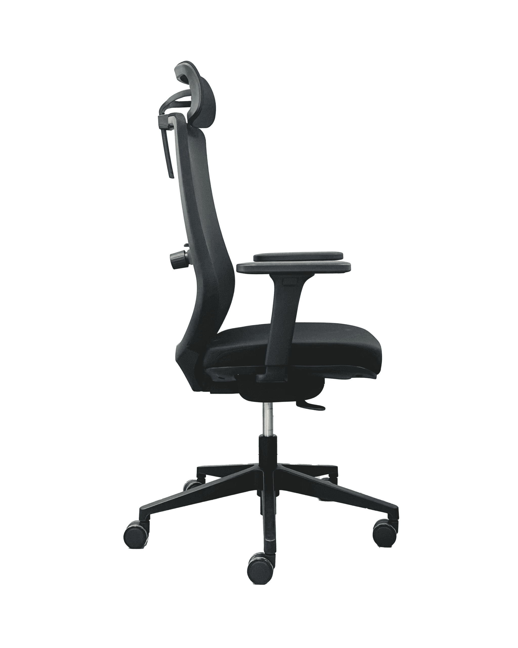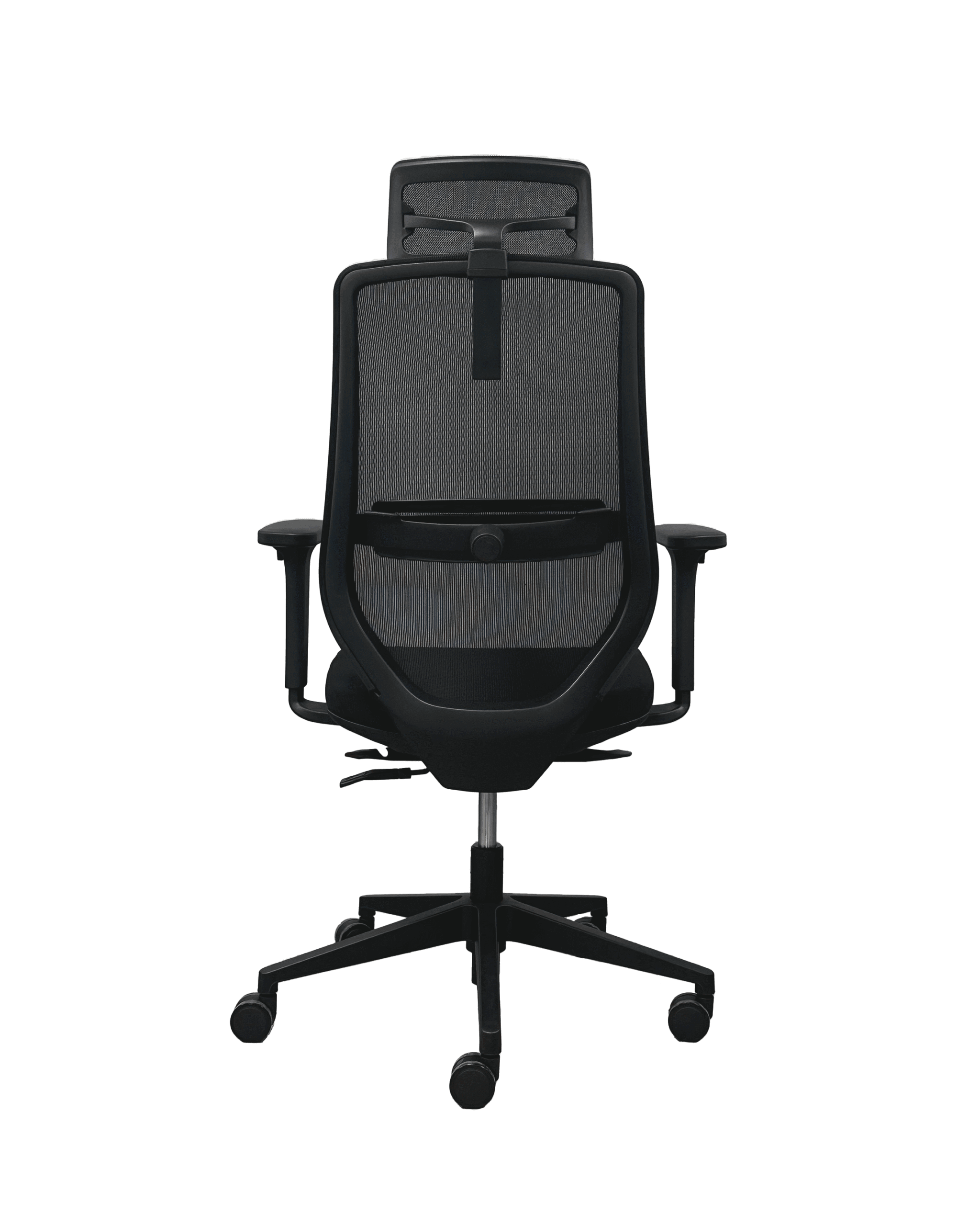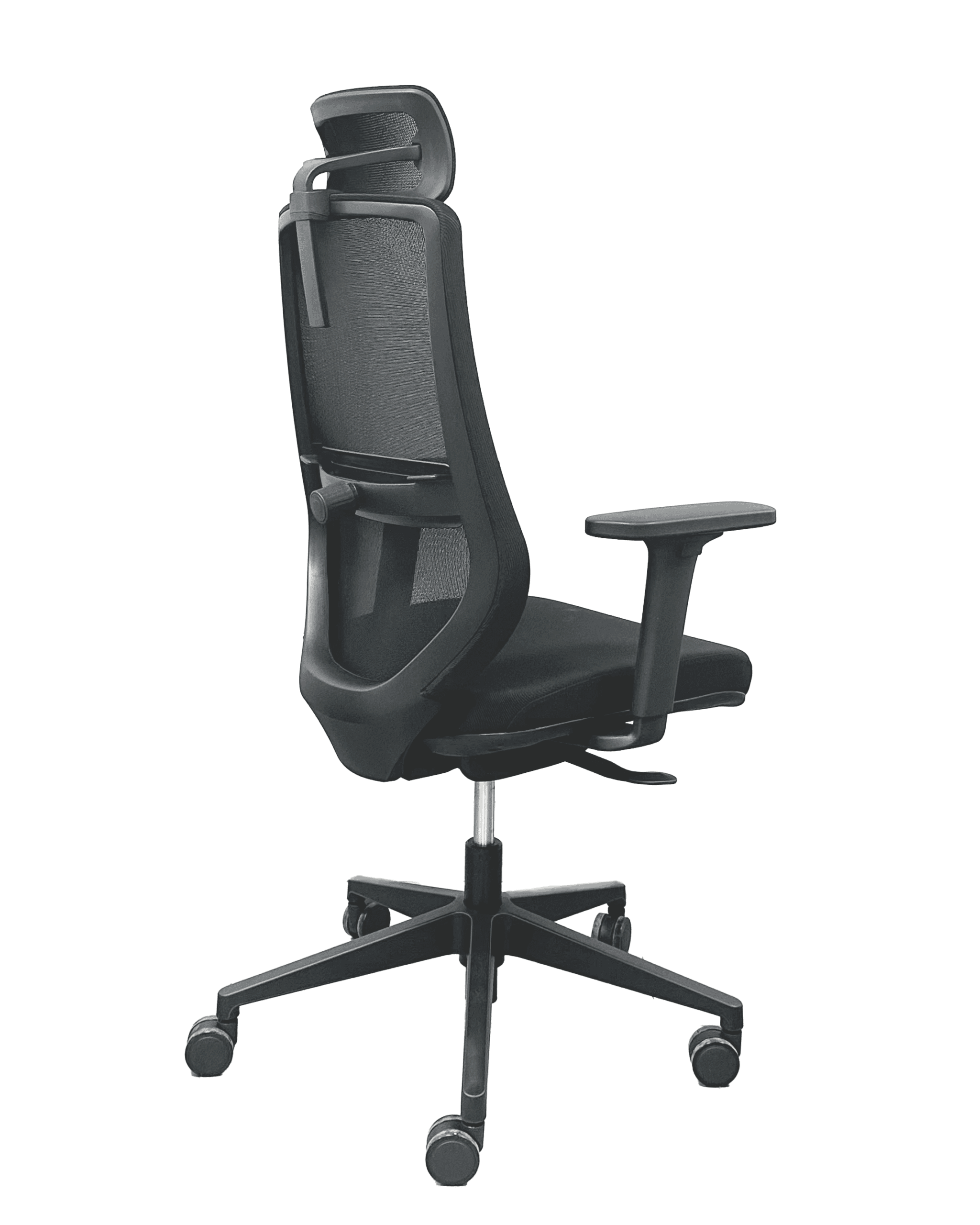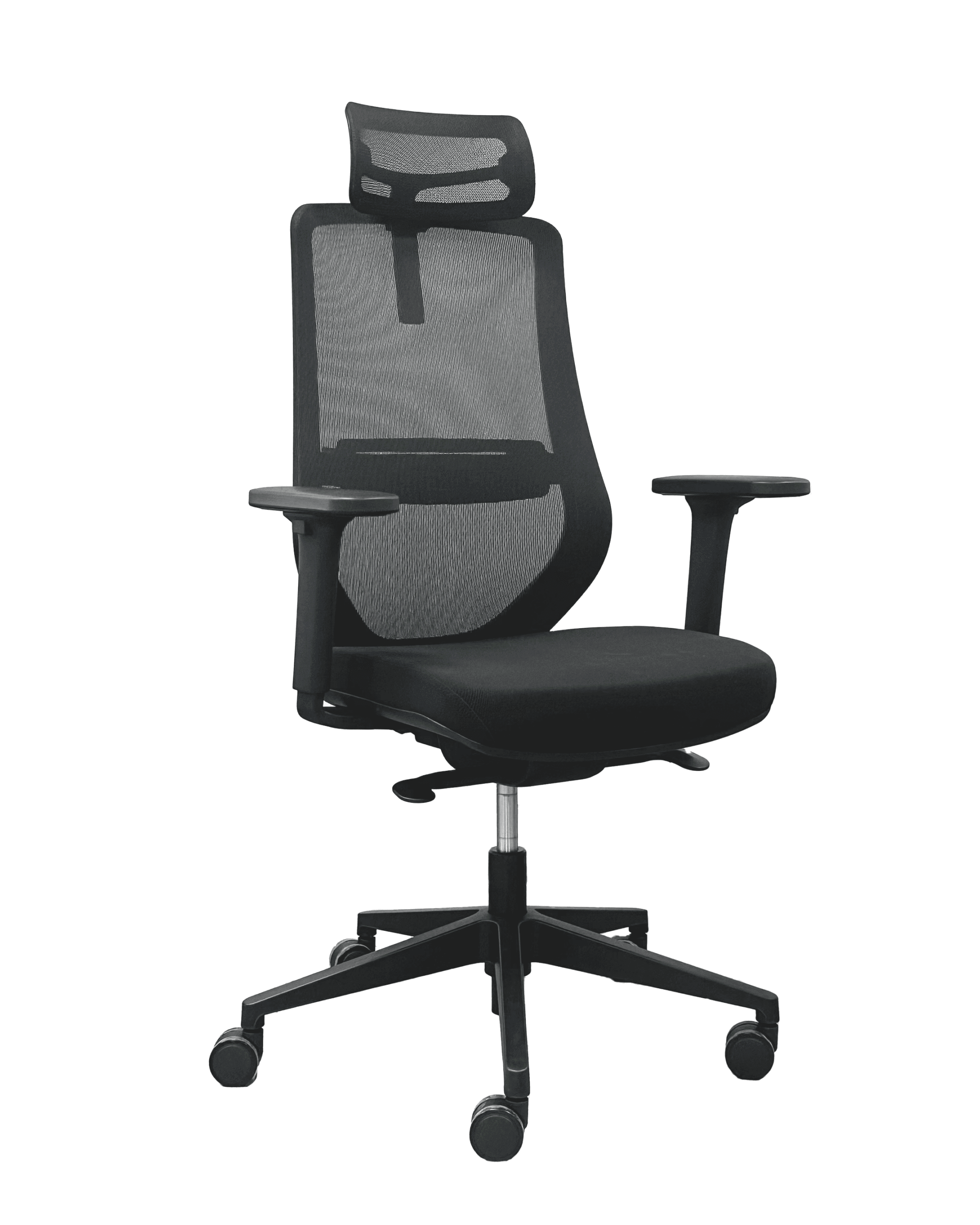 Silla con mecanismo sincrónico autopesante con desplazador de asiento y bloqueo en cuatro posiciones. Apoyacabezas de malla ajustable en altura. Respaldo de malla con soporte lumbar 2D regulable en altura y profundidad. Apoyabrazos 3D  regulable en altura, ángulo y profundidad. Asiento tapizado. Gas de 100 mm, base de nylon negro de R350 mm y ruedas negras de 60 mm.