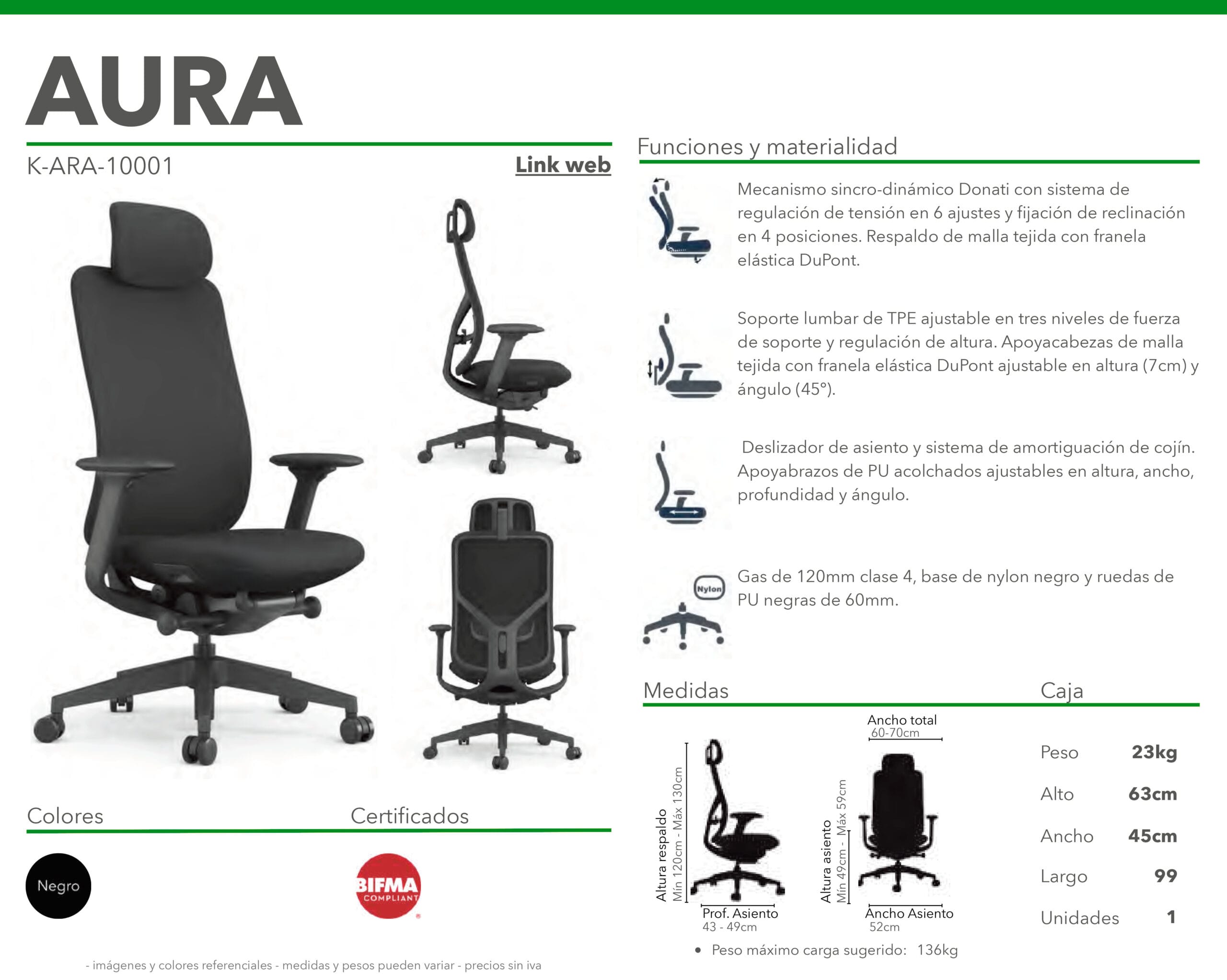 Silla con mecanismo sincro dinámico Donati con sistema de regulación de tensión en 6 ajustes y fijación de reclinación en 4 posiciones. Respaldo de malla tejida con franela elástica DuPont. Soporte lumbar de TPE ajustable en tres niveles de fuerza de soporte y regulación de altura. Apoyacabezas de malla tejida con franela elástica DuPont ajustable en altura (7cm) y ángulo (45º).  Deslizador de asiento y sistema de amortiguación de cojín. Apoyabrazos de PU acolchados ajustables en altura, ancho, profundidad y ángulo. Gas clase 4, base de nylon negro y ruedas de PU negras.