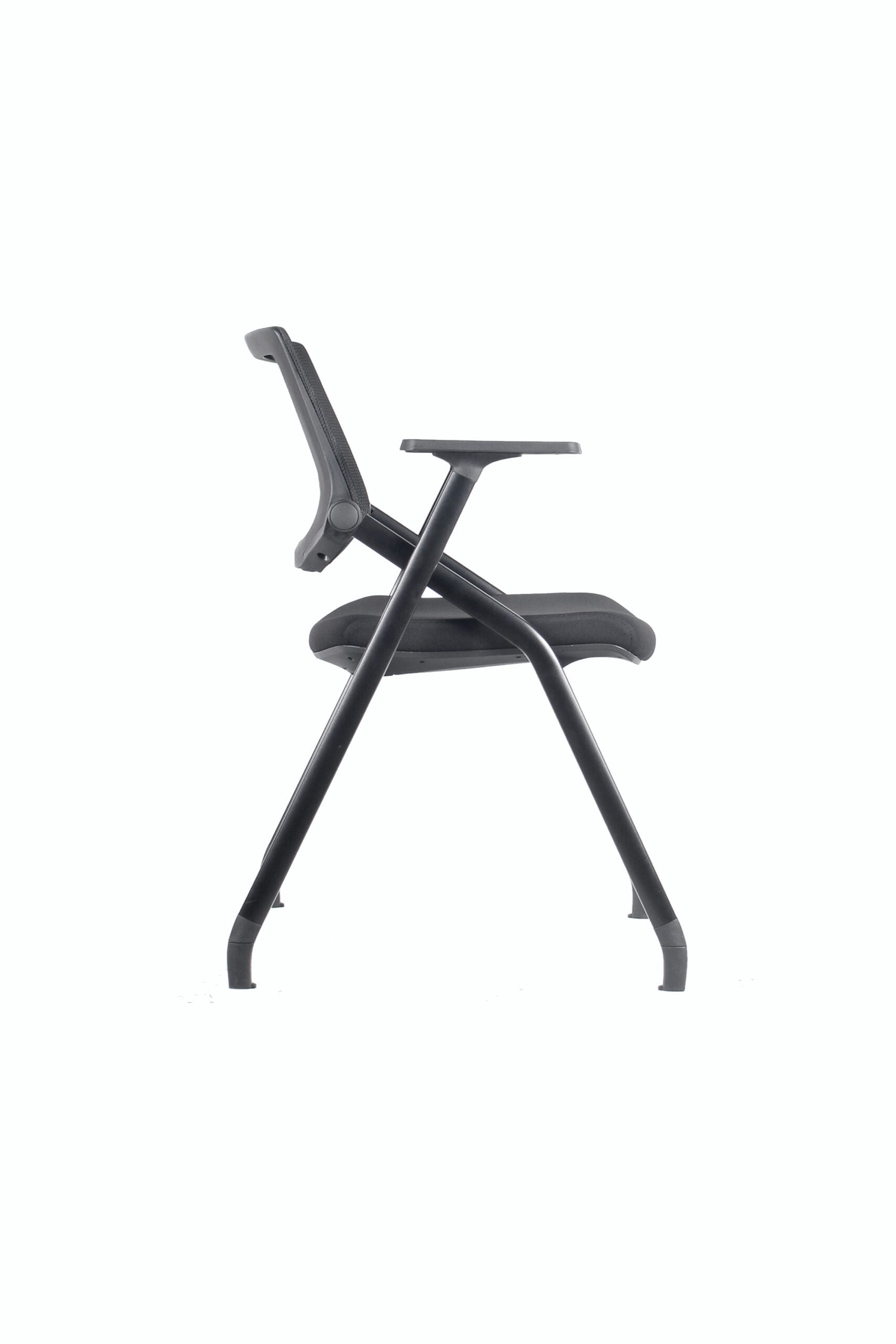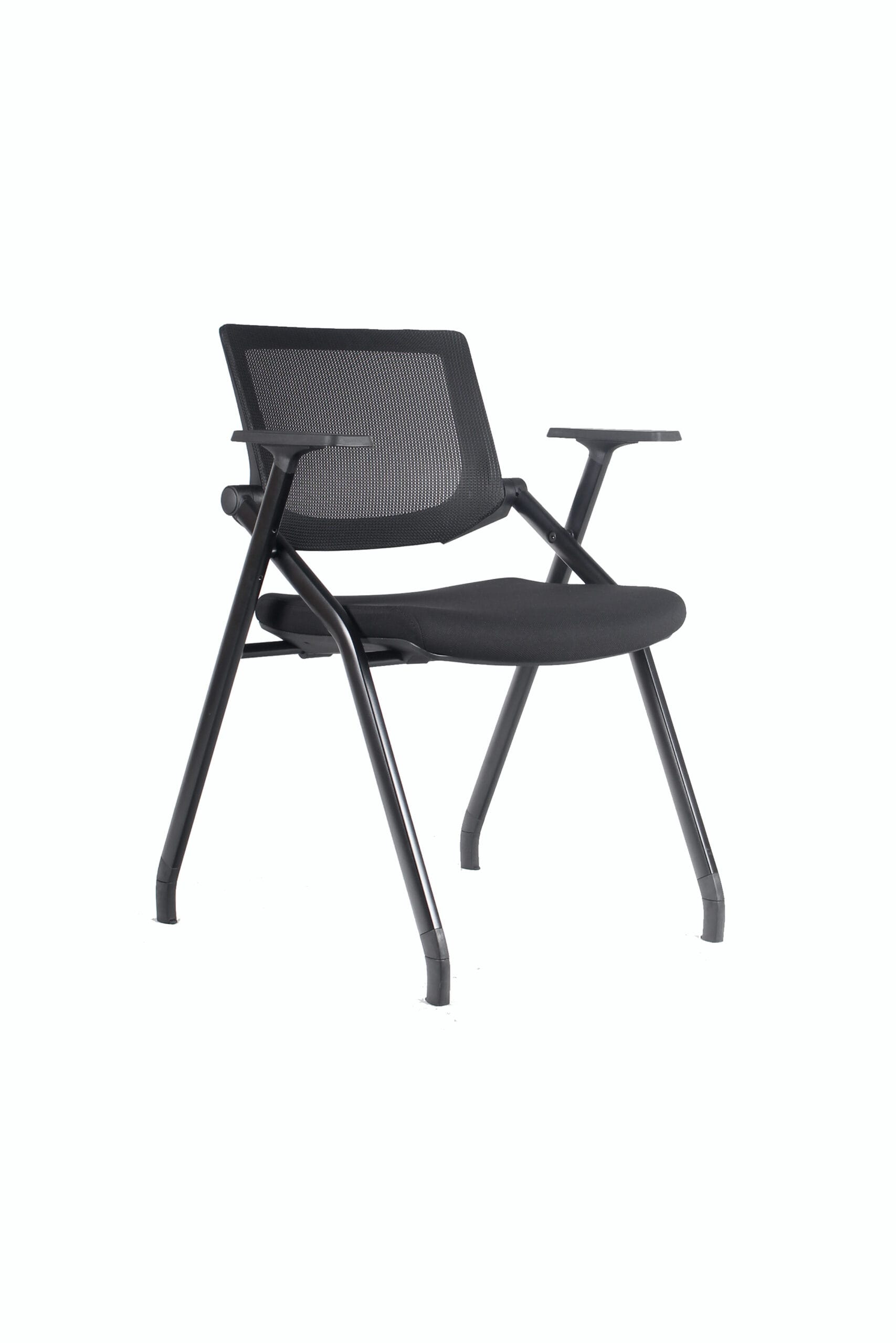 Silla con respaldo de malla con reclinación. Asiento de espuma tapizada y estructura de acero de cuatro patas pintado negro, plegable y con patines o ruedas