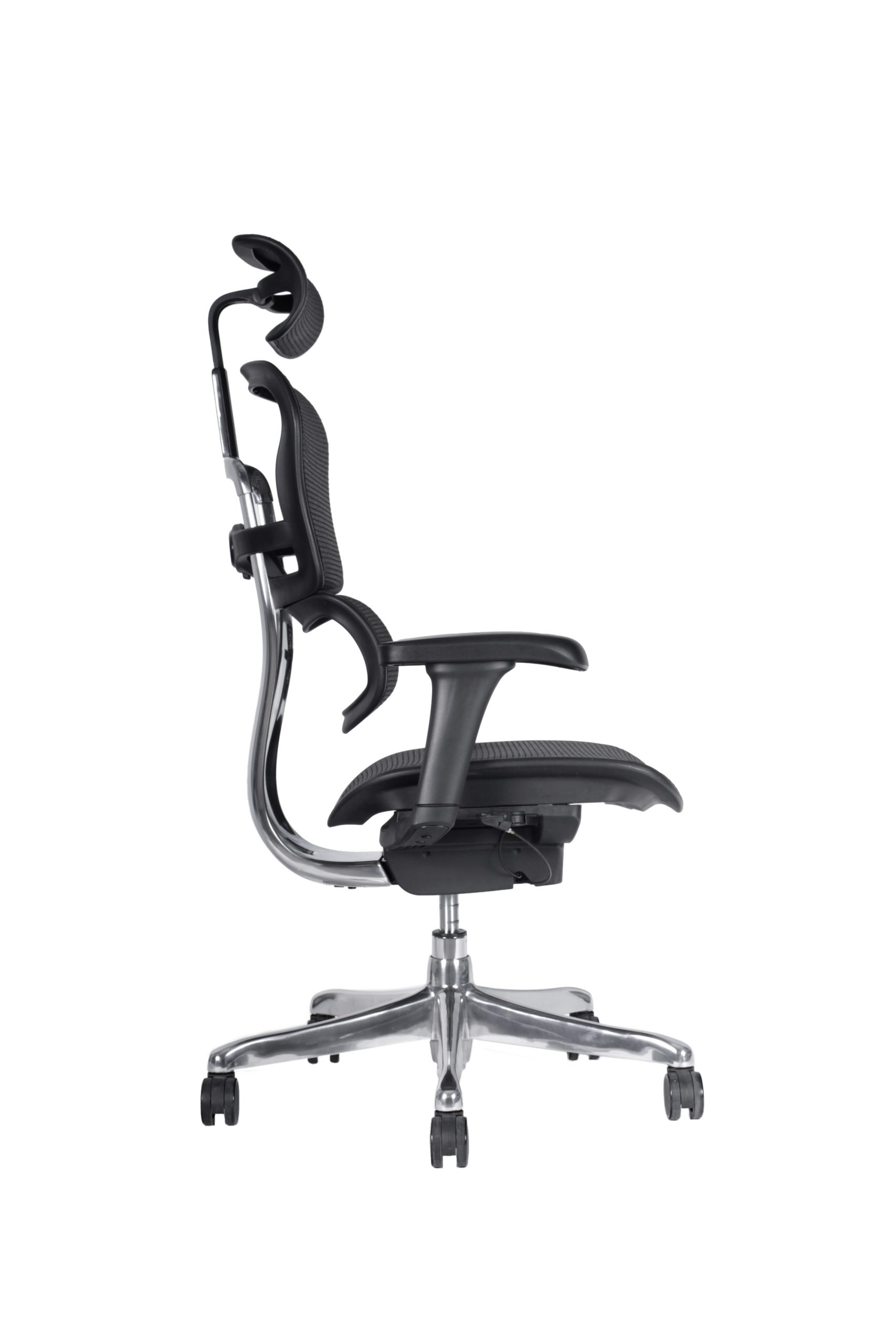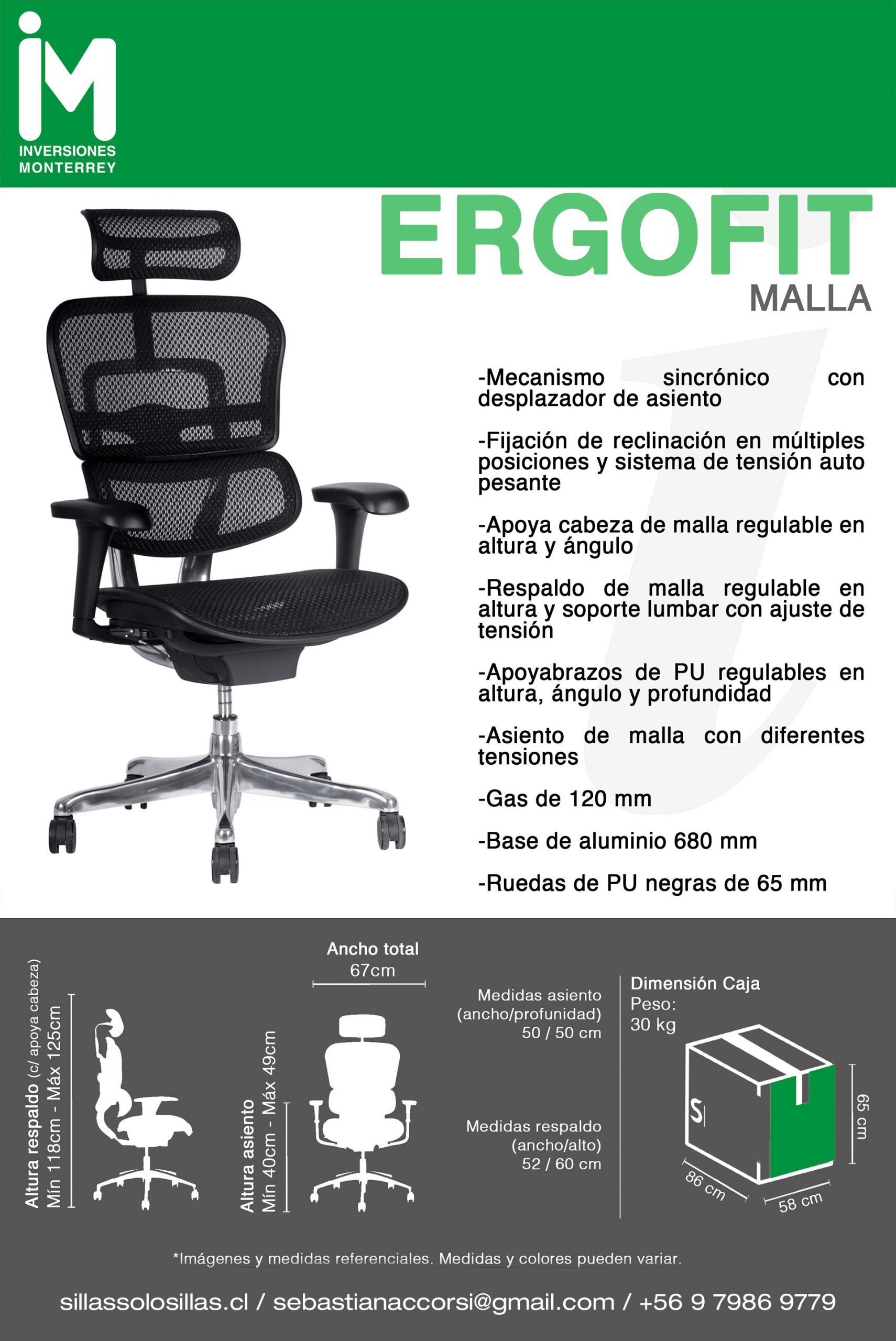 Silla con mecanismo sincrónico con desplazador de asiento, fijación de reclinación en múltiples posiciones y sistema de tensión auto pesante. Apoya cabeza de malla regulable en altura y ángulo. Respaldo de malla regulable en altura y soporte lumbar con ajuste de tensión. Apoyabrazos de PU regulables en altura, ángulo y profundidad. Asiento de malla con diferentes tensiones, gas de 120 mm, base de aluminio 680 mm y ruedas de PU negras de 65 mm.