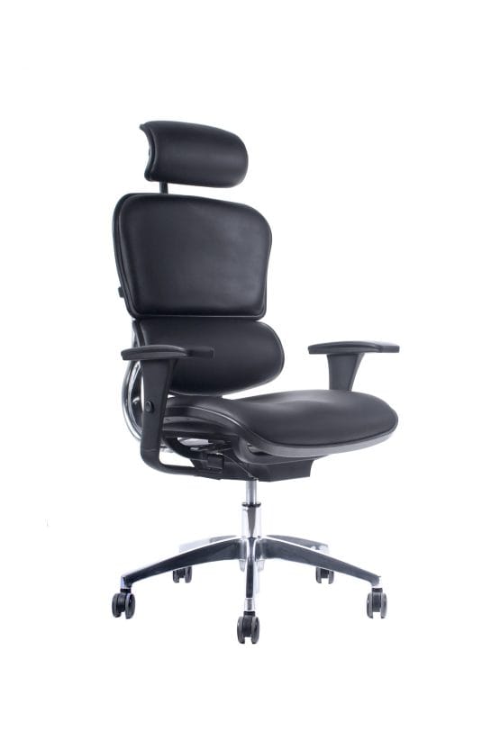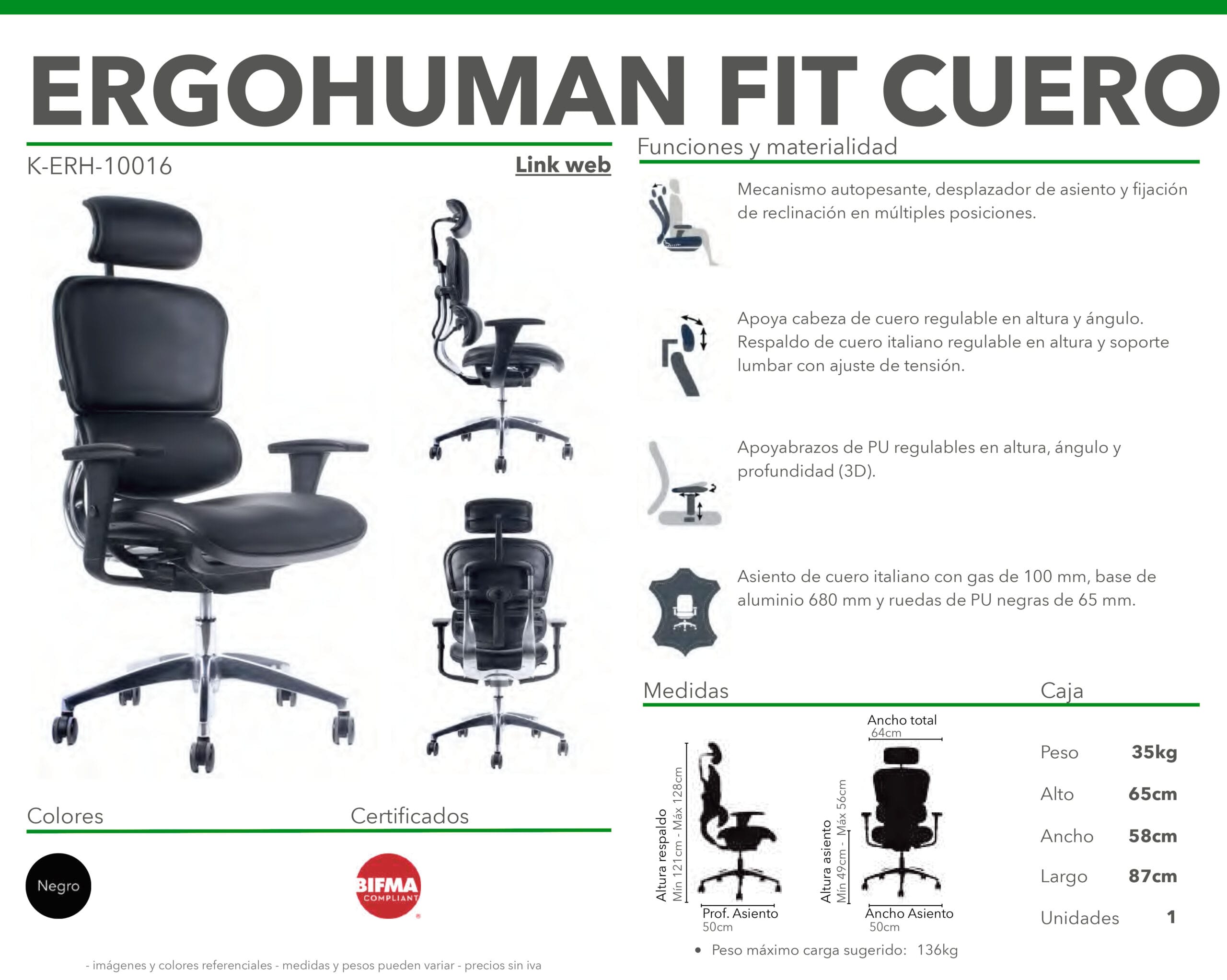 Silla con mecanismo autopesante, desplazador de asiento y fijación de reclinación en múltiples posiciones. Apoya cabeza de cuero regulable en altura y ángulo. Respaldo de cuero italiano regulable en altura y soporte lumbar con ajuste de tensión. Apoyabrazos de PU regulables en altura, ángulo y profundidad. Asiento de cuero italiano con diferentes tensiones, gas de 100 mm, base de aluminio 680 mm y ruedas de PU negras de 65 mm.
