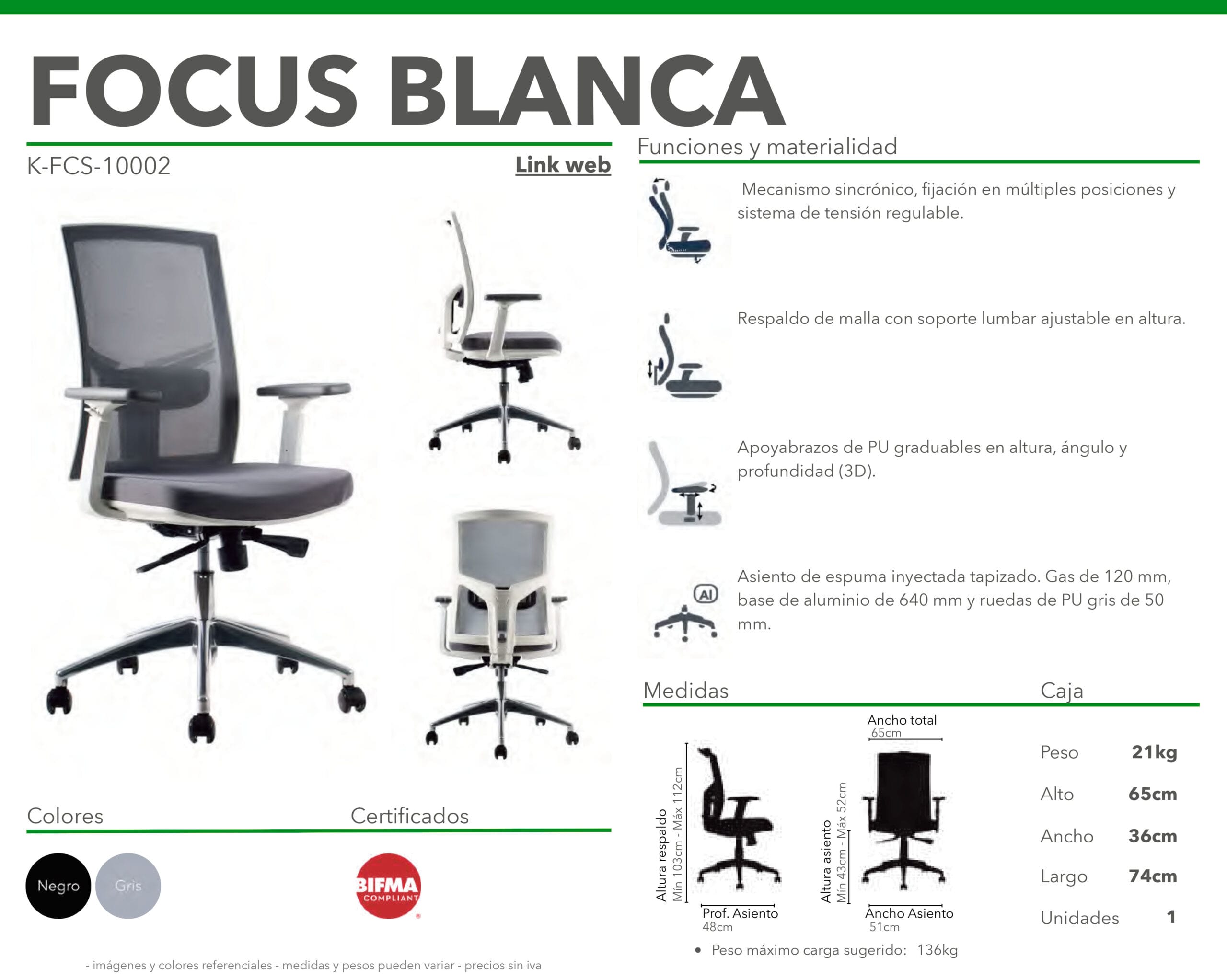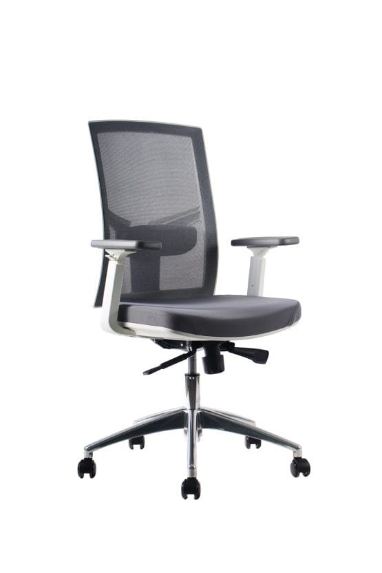 Silla con mecanismo sincrónico, fijación en múltiples posiciones y sistema de tensión regulable. Respaldo de malla con soporte lumbar ajustable en altura. Apoyabrazos de PU graduables en altura, ángulo y profundidad. Asiento de espuma inyectada tapizado. Gas de 120 mm, base de aluminio de 640 mm y ruedas de PU gris de 50 mm.
