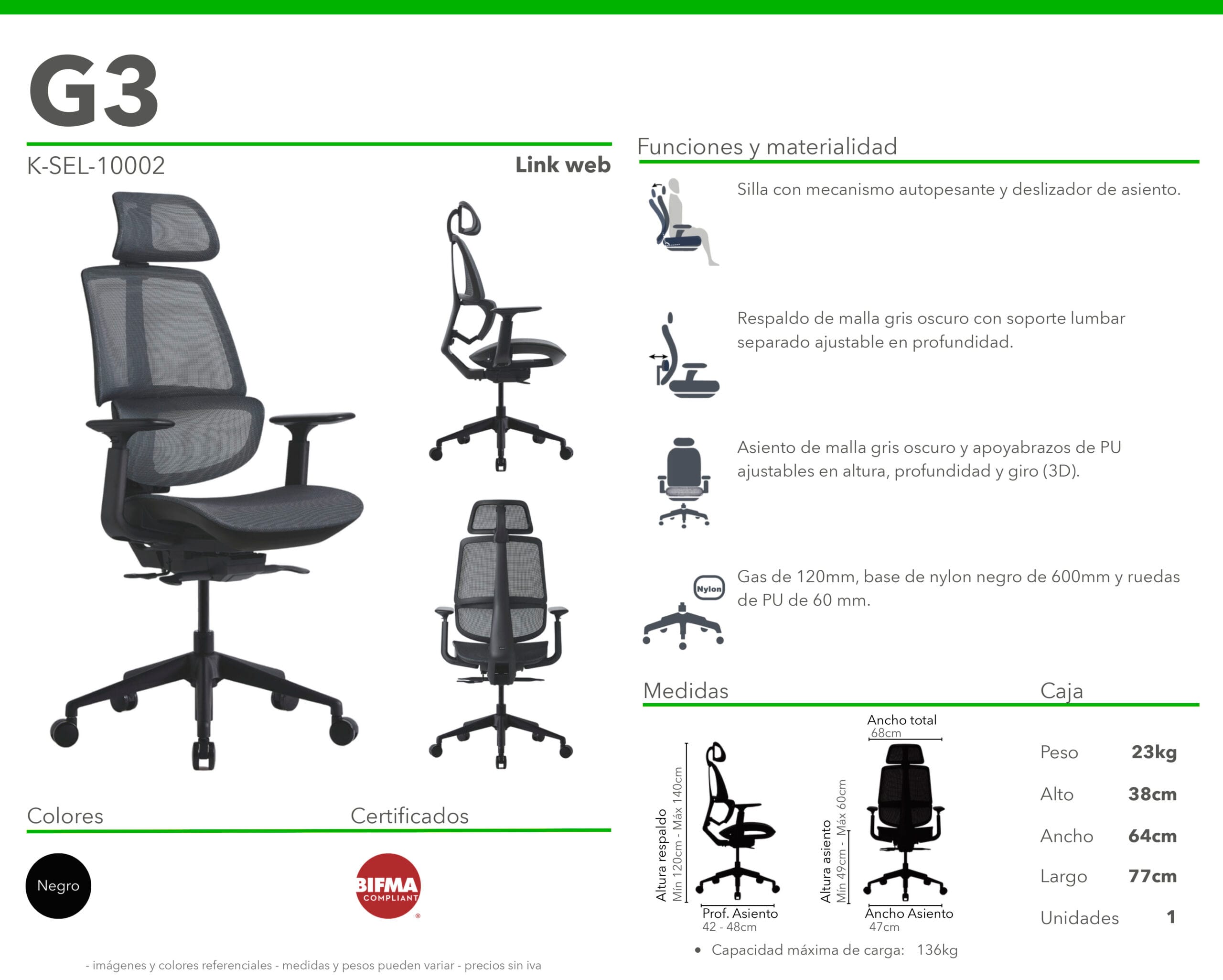 Silla con mecanismo autopesante y deslizador de asiento. Respaldo de malla gris oscuro con soporte lumbar separado ajustable en profundidad. Asiento de malla gris oscuro y apoyabrazos de PU ajustables en altura, profundidad y giro (3D). Gas de 120mm, base de nylon negro de 600mm y ruedas de PU de 60 mm.