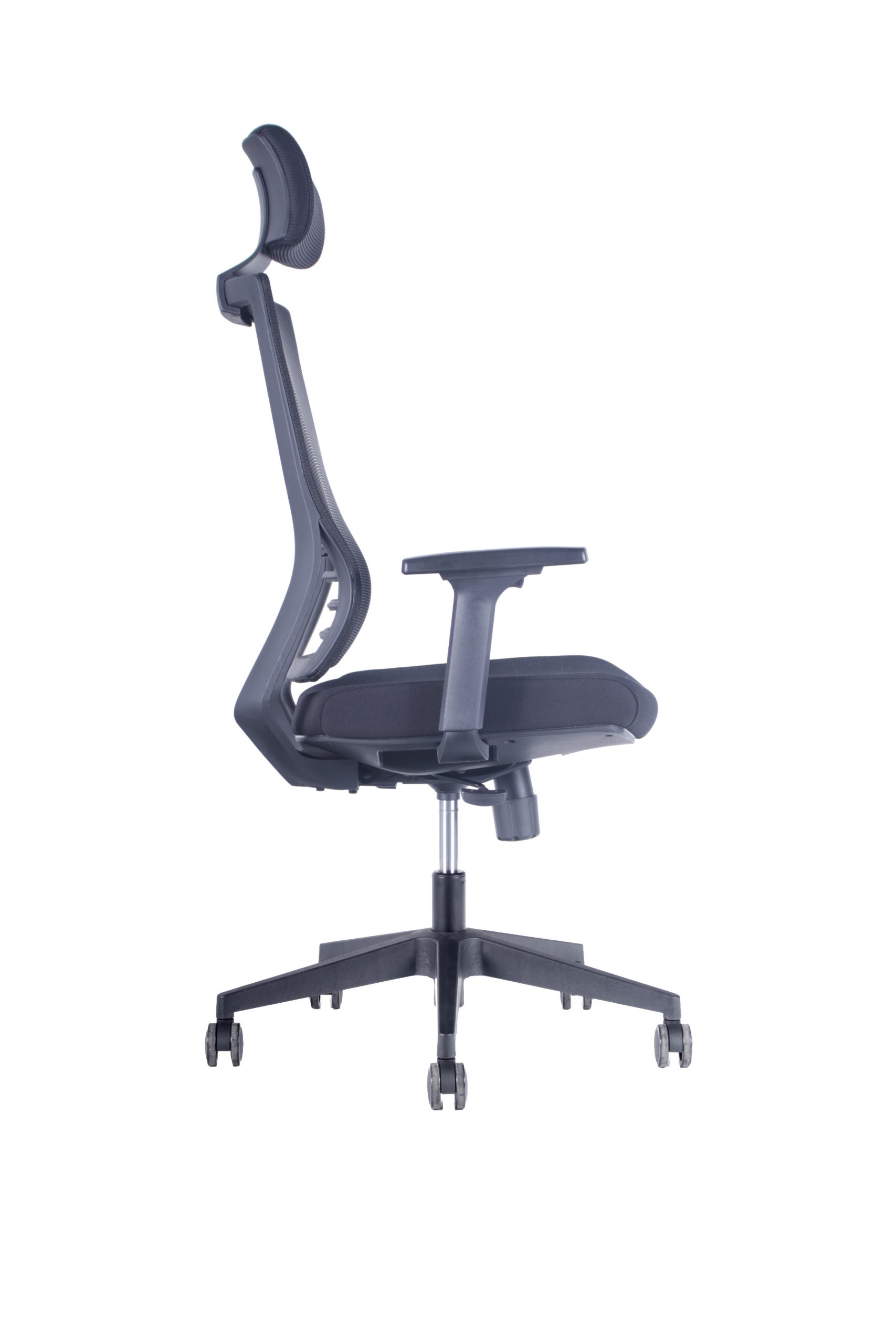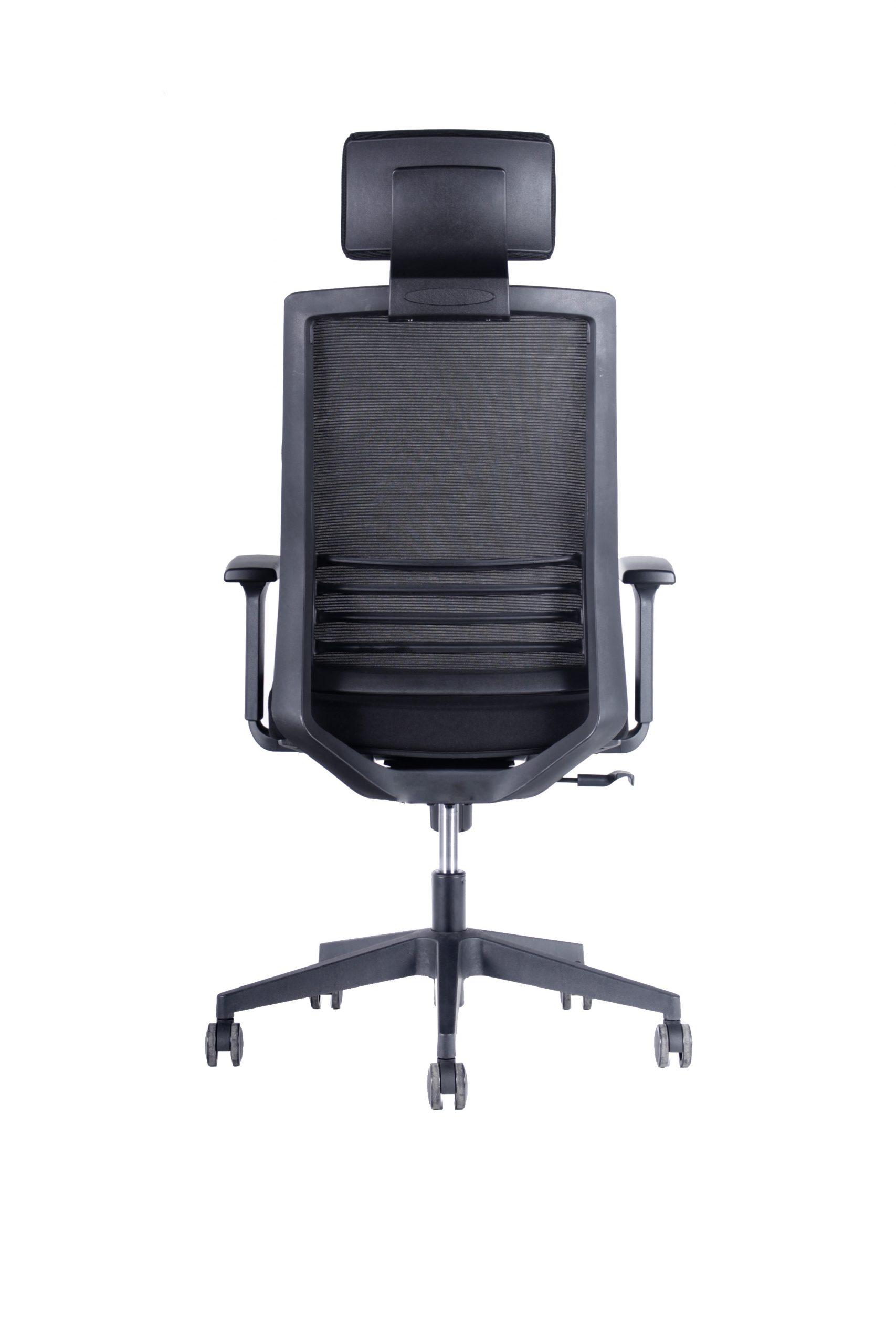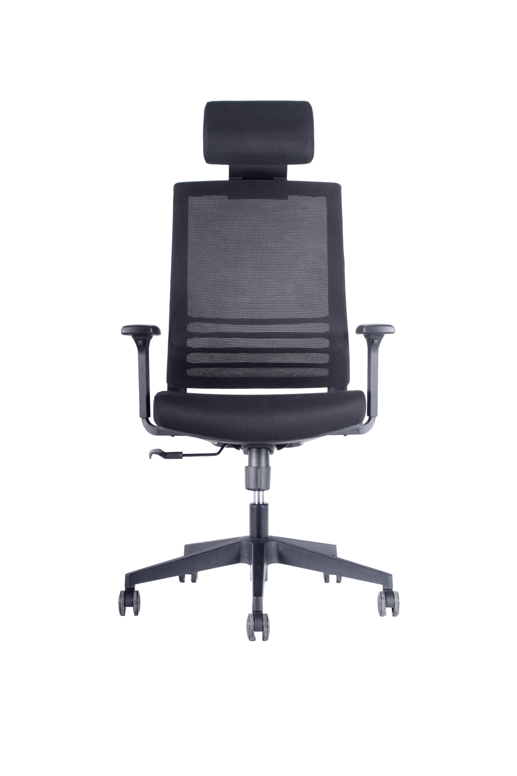 Silla con mecanismo sincrónico y fijación en múltiples posiciones con sistema de tensión regulable. Apoya cabezas de malla regulable en altura, opcional. Respaldo de malla con soporte lumbar dinámico. Apoya brazos de PP regulables en altura. Asiento de espuma inyectada tapizado en tela. Gas de 120mm, base de nylon de 660mm y ruedas de PU negras de 60mm.