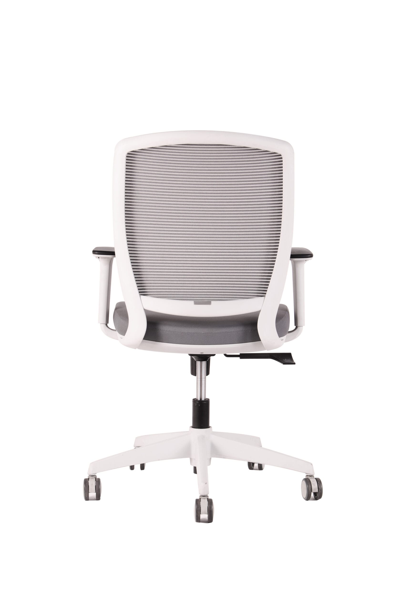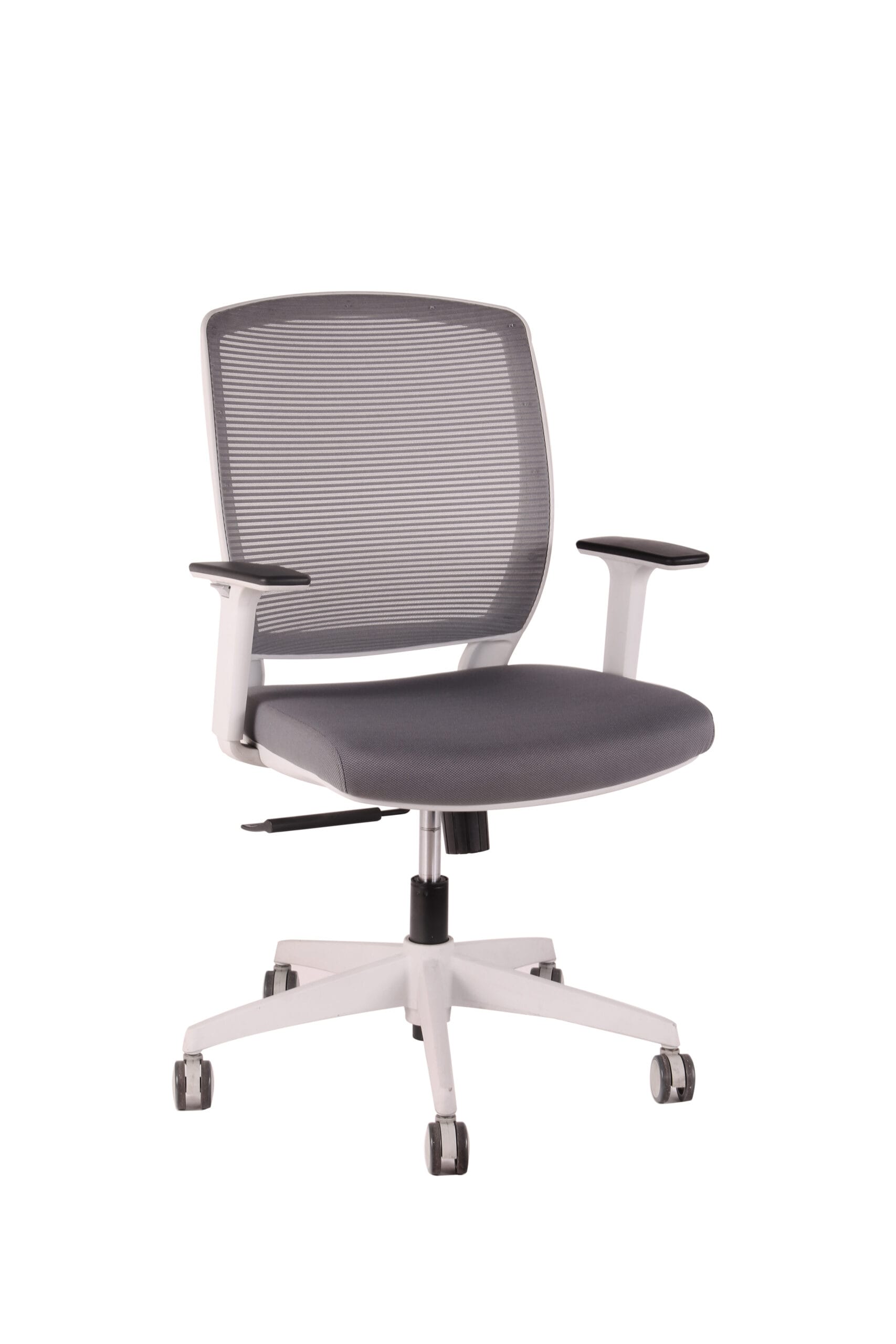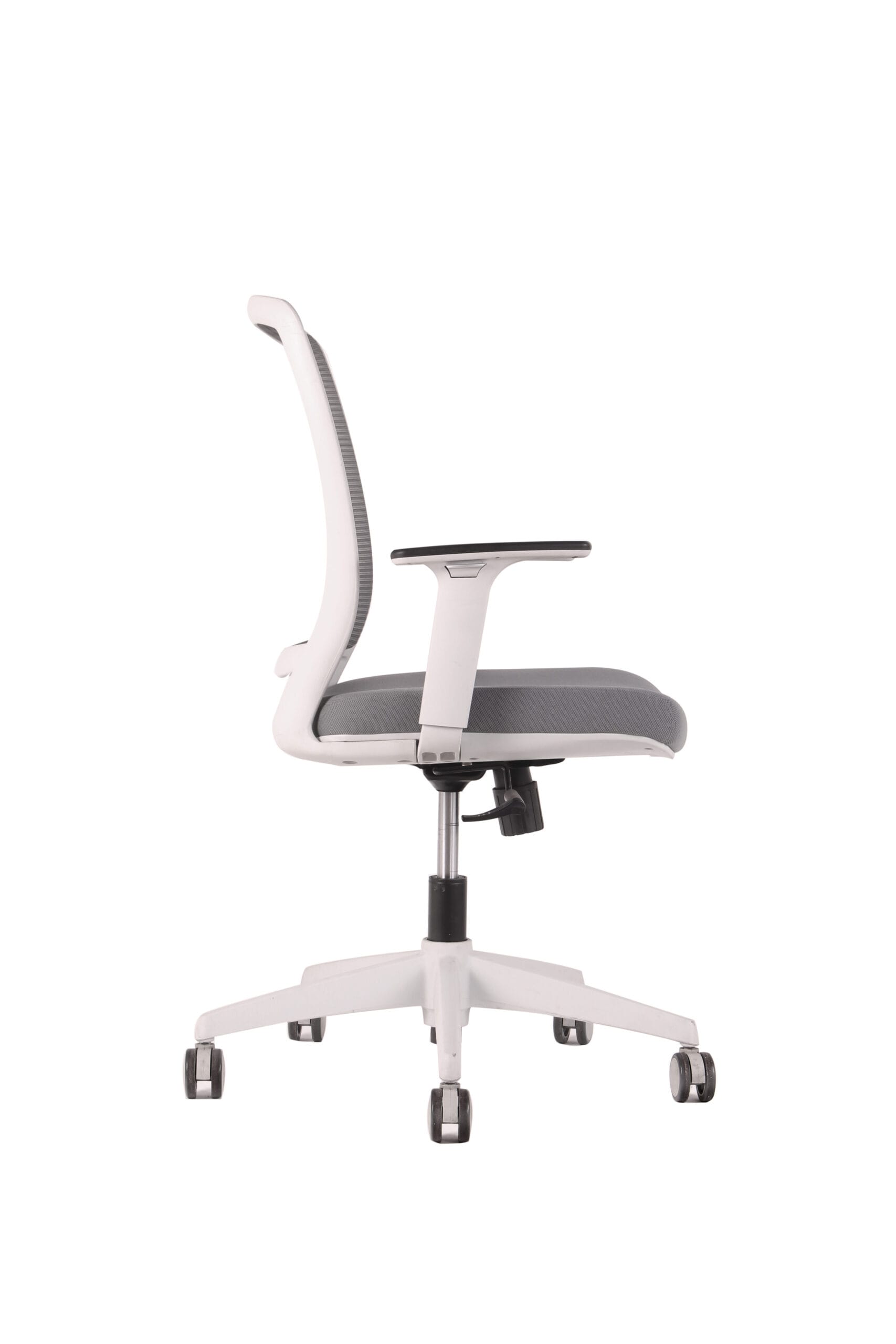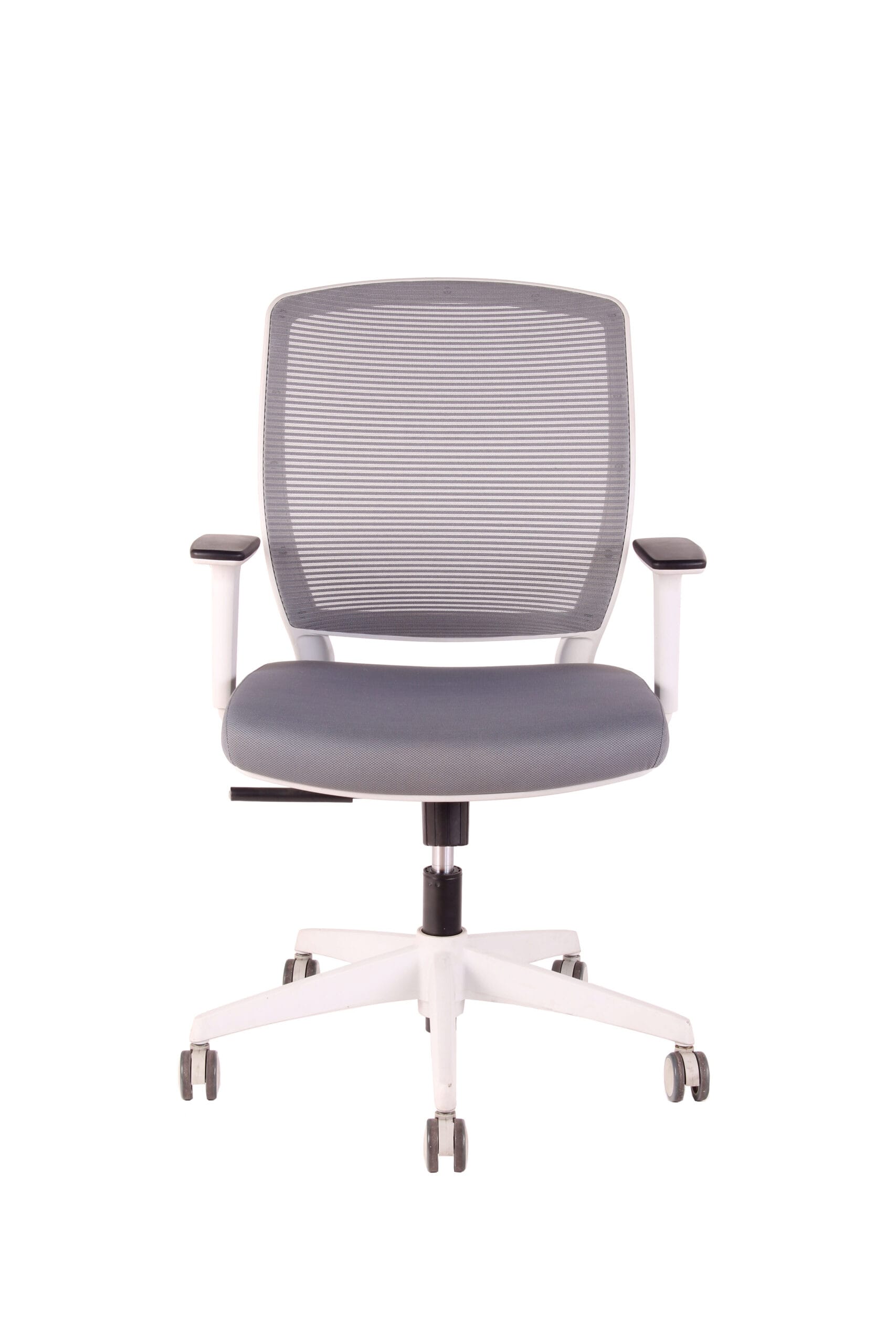 Silla con mecanismo de reclinación simple y sistema de tensión regulable. Respaldo de malla y apoyabrazos de PU ajustables en altura. Asiento de espuma inyectada tapizado, gas de 120 mm, base de nylon de 640mm y ruedas de PU gris de 65 mm.
