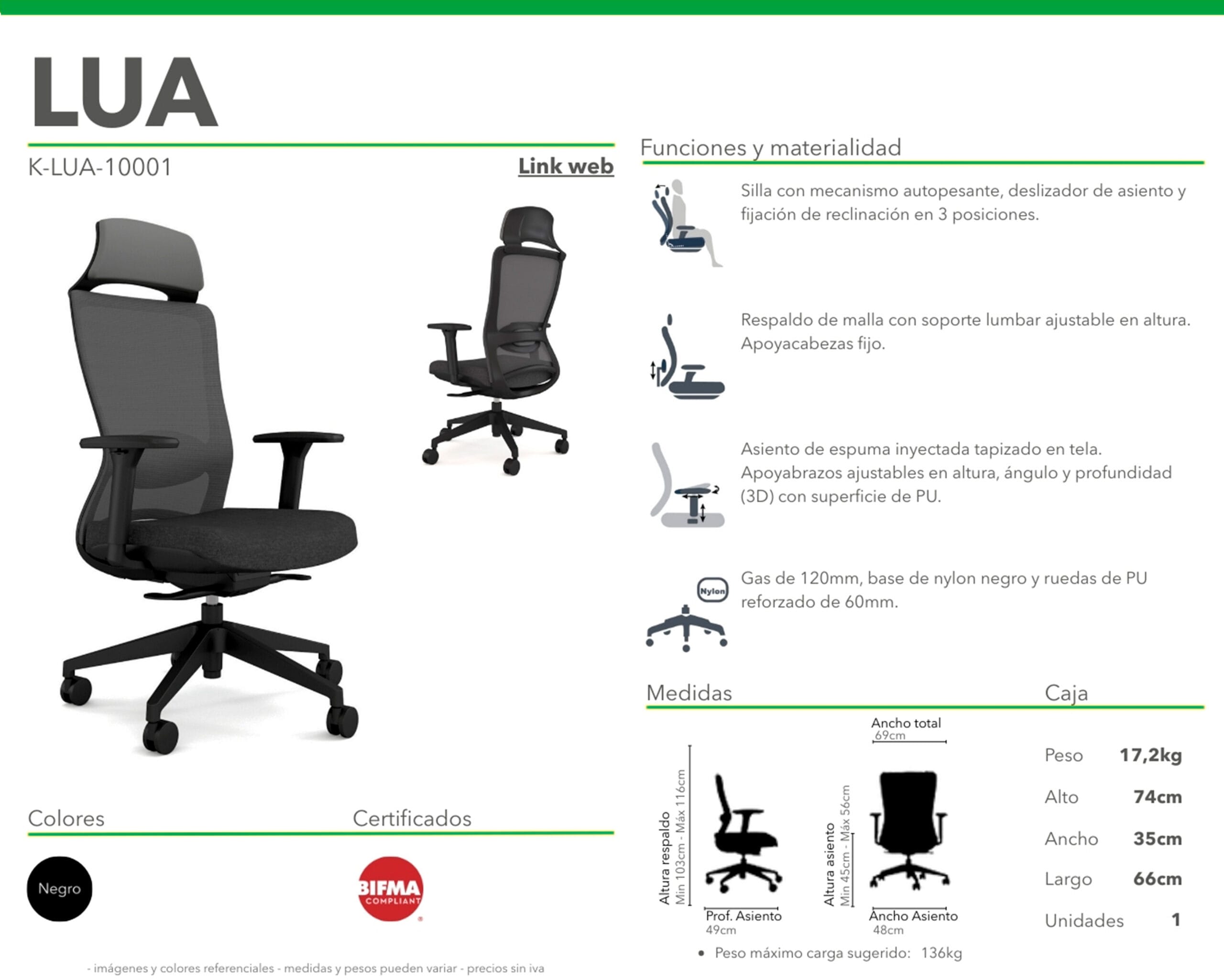 Silla con mecanismo autopesante, deslizador de asiento y fijación de reclinación en 3 posiciones. Respaldo de malla con soporte lumbar ajustable en altura. Asiento de espuma inyectada tapizado en tela. Apoyabrazos ajustables en altura, ángulo y profundidad (3D) con superficie de PU. Gas de 120mm, base de nylon negro y ruedas de PU reforzado de 60mm.