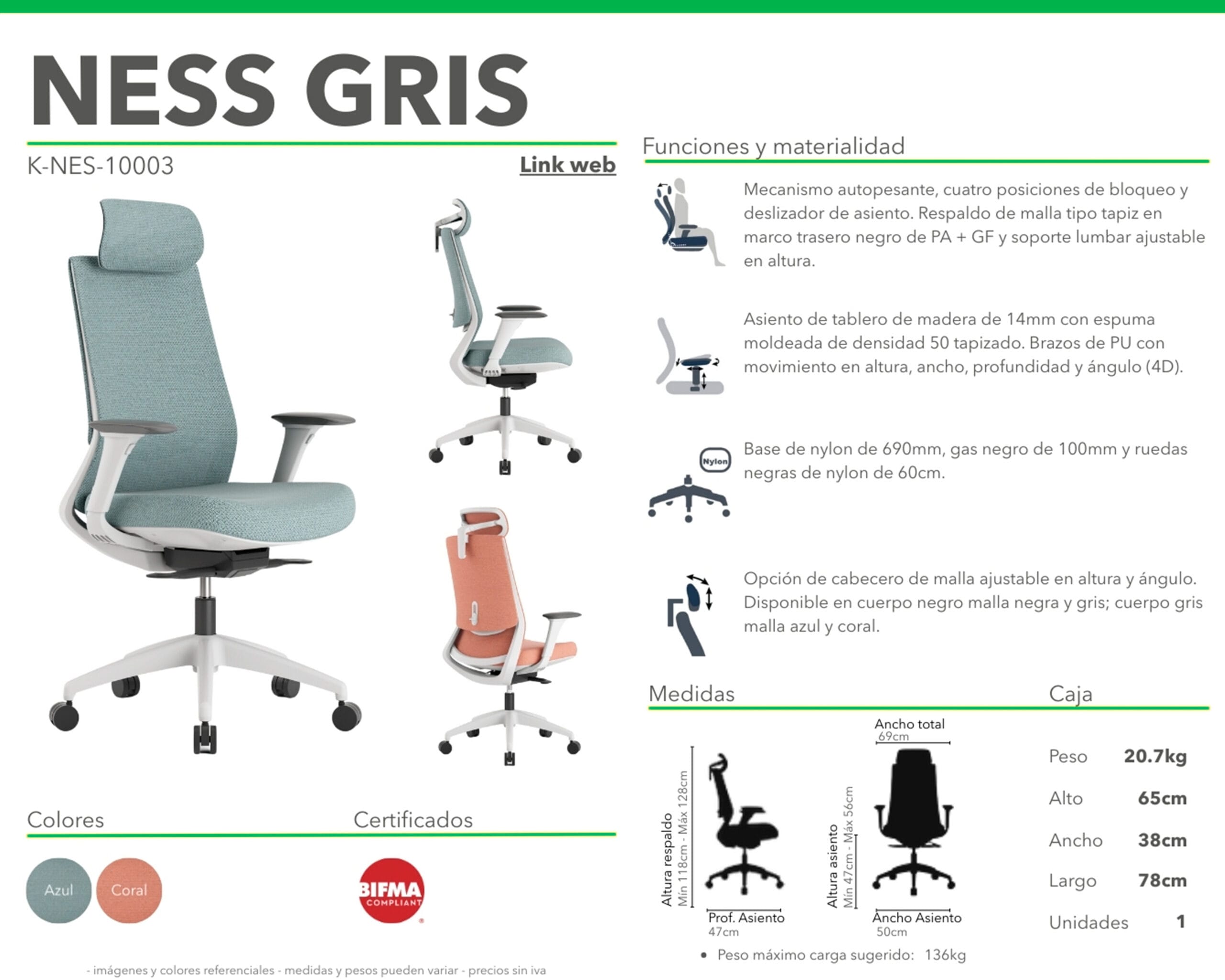 Silla con mecanismo autopesante, cuatro posiciones de bloqueo y deslizador de asiento. Respaldo de malla tipo tapiz en marco trasero negro de PA + GF y soporte lumbar ajustable en altura. Asiento de tablero de madera de 14mm con espuma moldeada de densidad 50 tapizado. Brazos de PU con movimiento en altura, ancho, profundidad y ángulo. Base de nylon de 345mm, gas negro clase 3 de 100mm y ruedas negras de nylon de 60R
