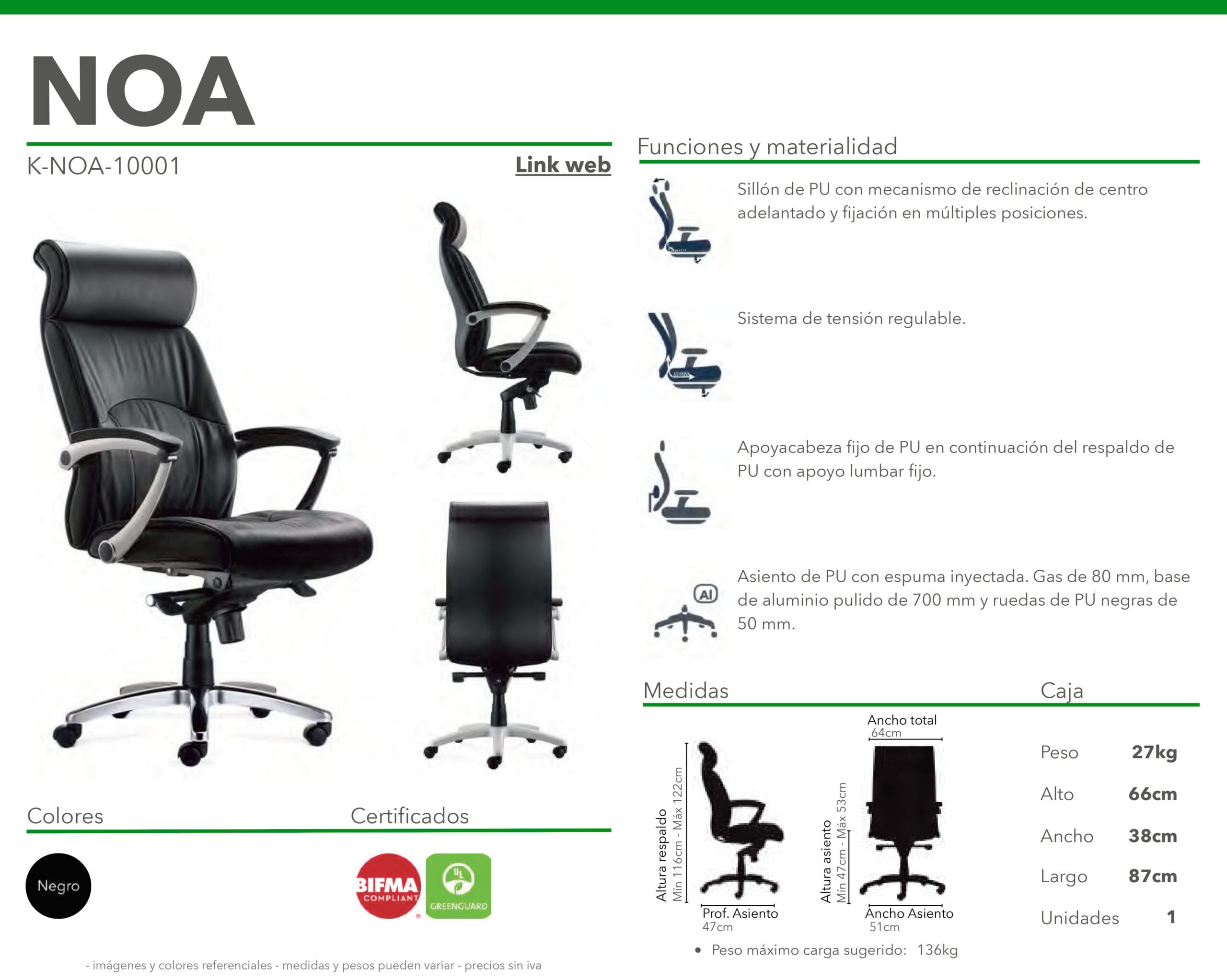 Sillón profesional con mecanismo de reclinación de centro adelantado y fijación en múltiples posiciones. Sistema de tensión regulable. Apoyacabeza fijo de PU en continuación del respaldo de PU con apoyo lumbar fijo. Asiento de PU con espuma inyectada. Gas de 80 mm, base de aluminio pulido de 700 mm y ruedas de PU negras de 50 mm.