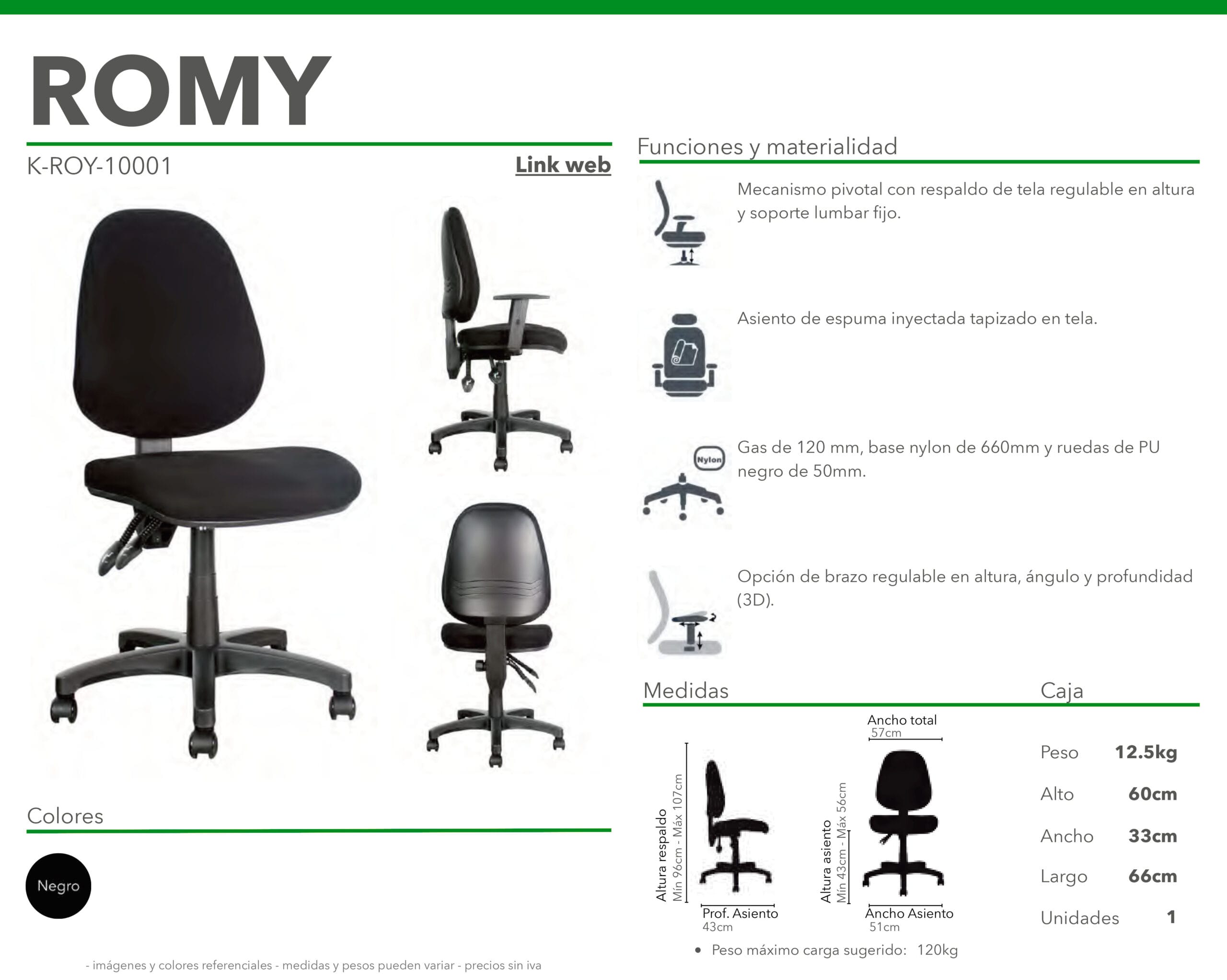 Silla Romy con mecanismo pivotal con respaldo de tela regulable en altura y soporte lumbar fijo. Asiento de espuma inyectada tapizado en tela, gas de 120 mm, base nylon de 660mm y ruedas de PU negro de 50mm.