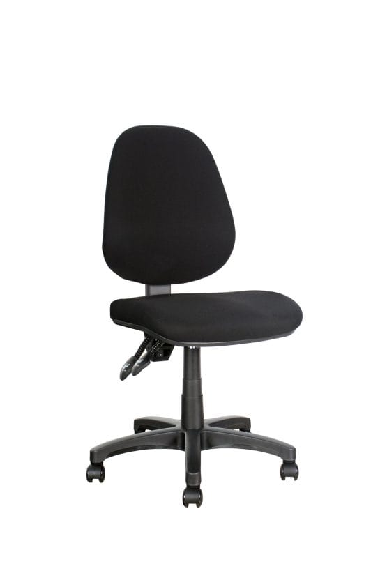 Silla Romy con mecanismo pivotal con respaldo de tela regulable en altura y soporte lumbar fijo. Asiento de espuma inyectada tapizado en tela, gas de 120 mm, base nylon de 660mm y ruedas de PU negro de 50mm.