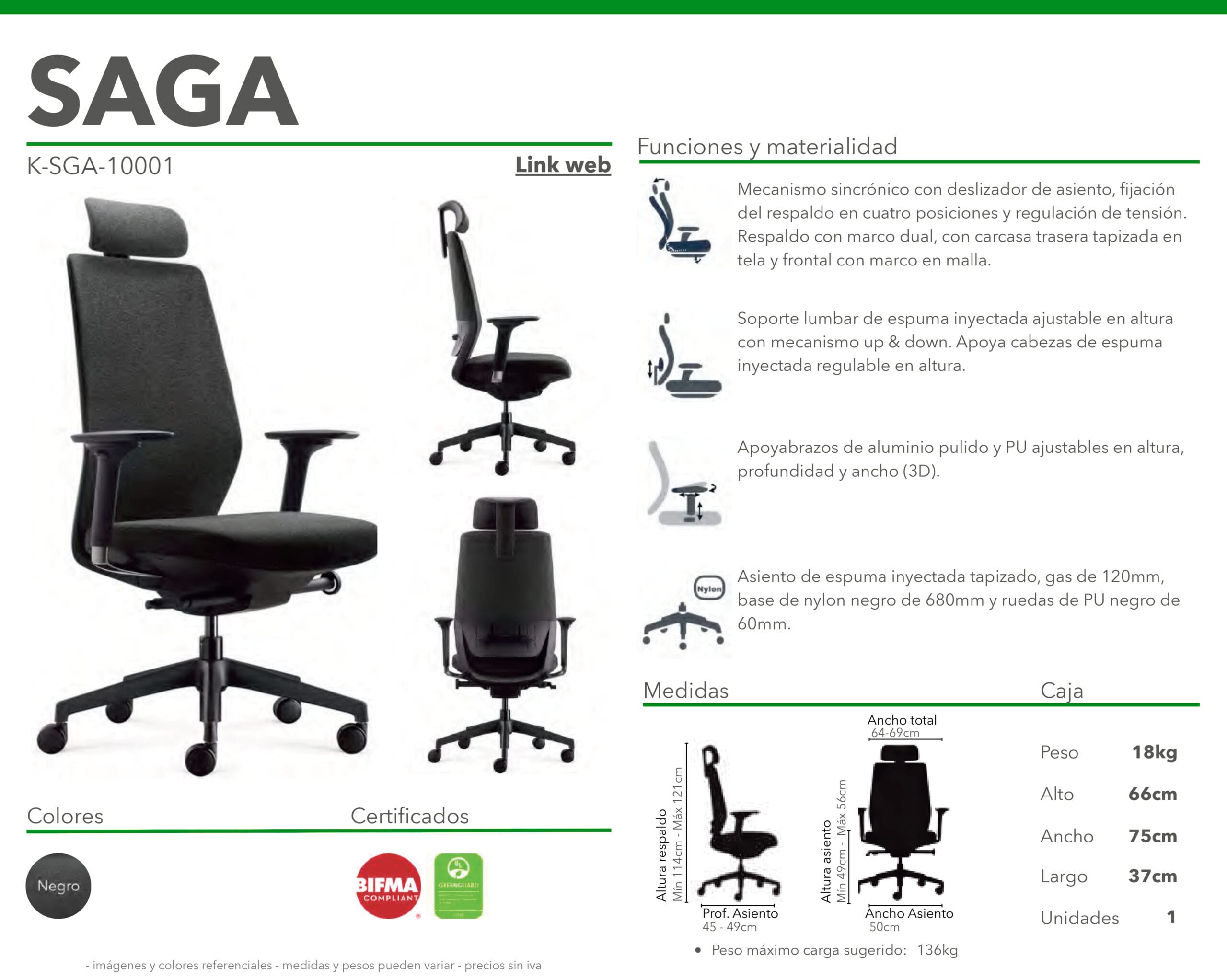 Silla con mecanismo sincrónico con deslizador de asiento, fijación del respaldo en cuatro posiciones y regulación de tensión.