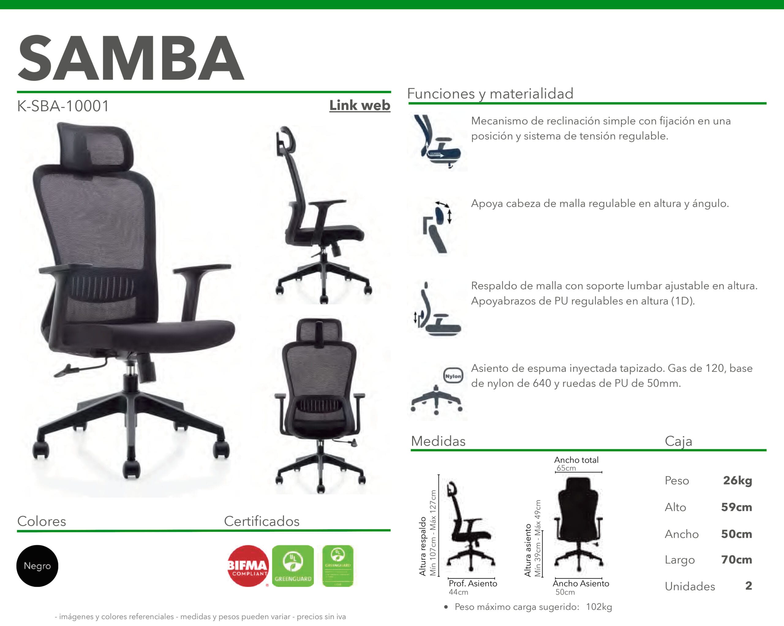 Silla con mecanismo de reclinación simple con fijación en una posición y sistema de tensión regulable. Apoya cabeza de malla regulable en altura y ángulo. Respaldo de malla con soporte lumbar ajustable en altura. Apoyabrazos de PU regulables en altura. Asiento de espuma inyectada tapizado. Gas de 120, base de nylon de 640 y ruedas de PU de 50mm.