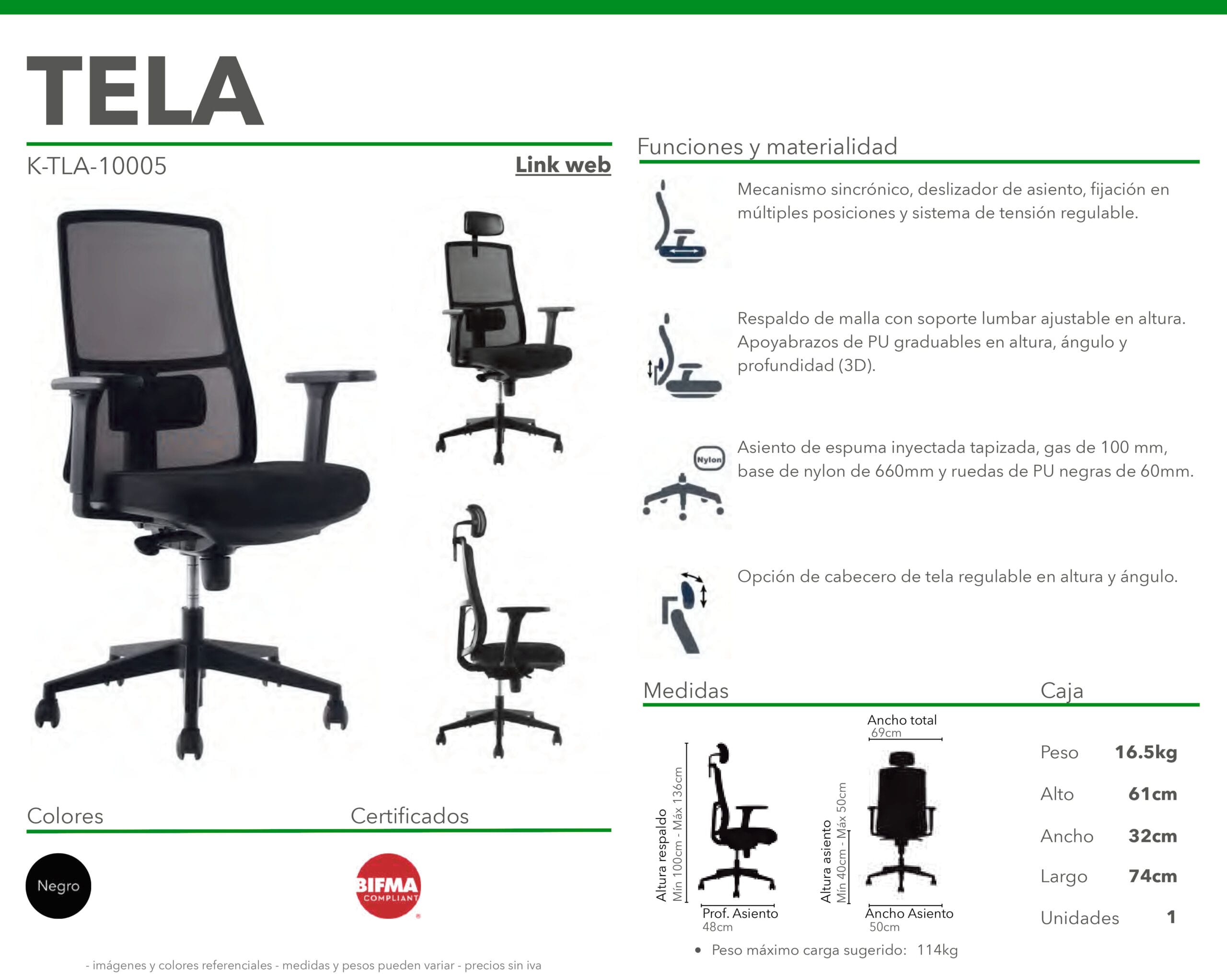 Silla con mecanismo sincrónico, deslizador de asiento, fijación en múltiples posiciones y sistema de tensión regulable. Respaldo de malla con soporte lumbar ajustable en altura. Apoyabrazos de PU graduables en altura, ángulo y profundidad. Asiento de espuma inyectada tapizada, gas de 100 mm, base de nylon de 660 mm y ruedas de PU negras de 50 mm. Opción de cabecero de tela regulable en altura y ángulo.