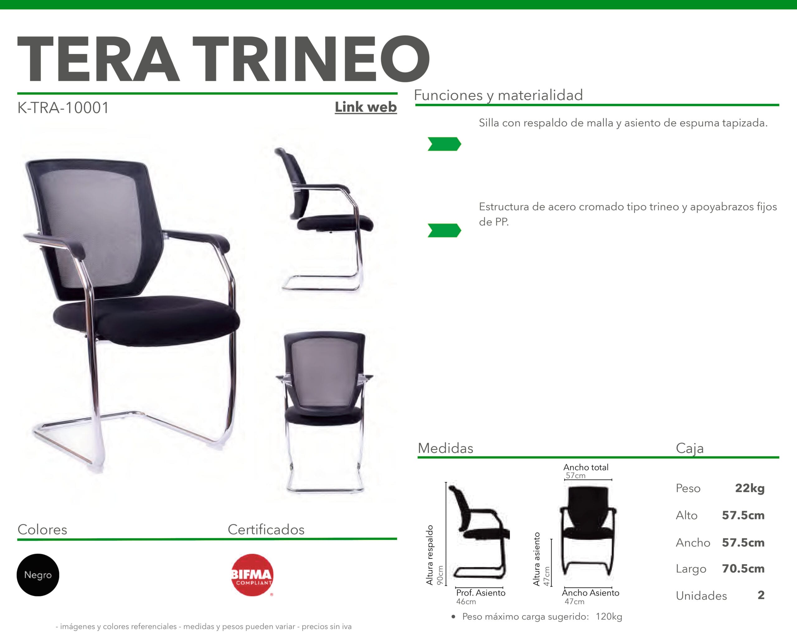 Silla con respaldo de malla y asiento de espuma tapizada. Estructura de acero cromado tipo trineo y apoyabrazos fijos de PP.