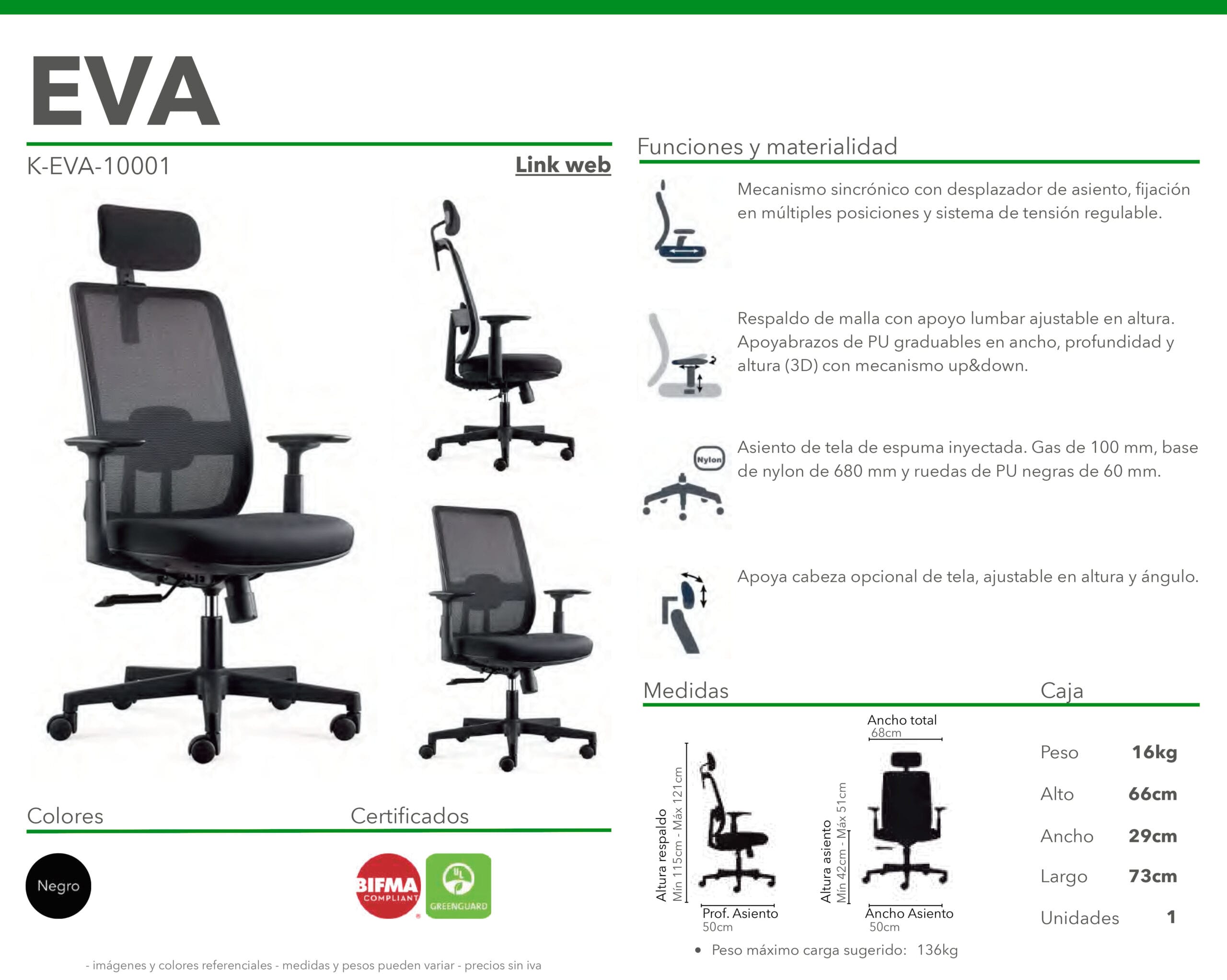 Silla profesional con mecanismo sincrónico con desplazador de asiento, fijación en múltiples posiciones y sistema de tensión regulable. Respaldo de malla con apoyo lumbar ajustable en altura. Apoyabrazos de PU graduables en altura, ancho y profundidad.
