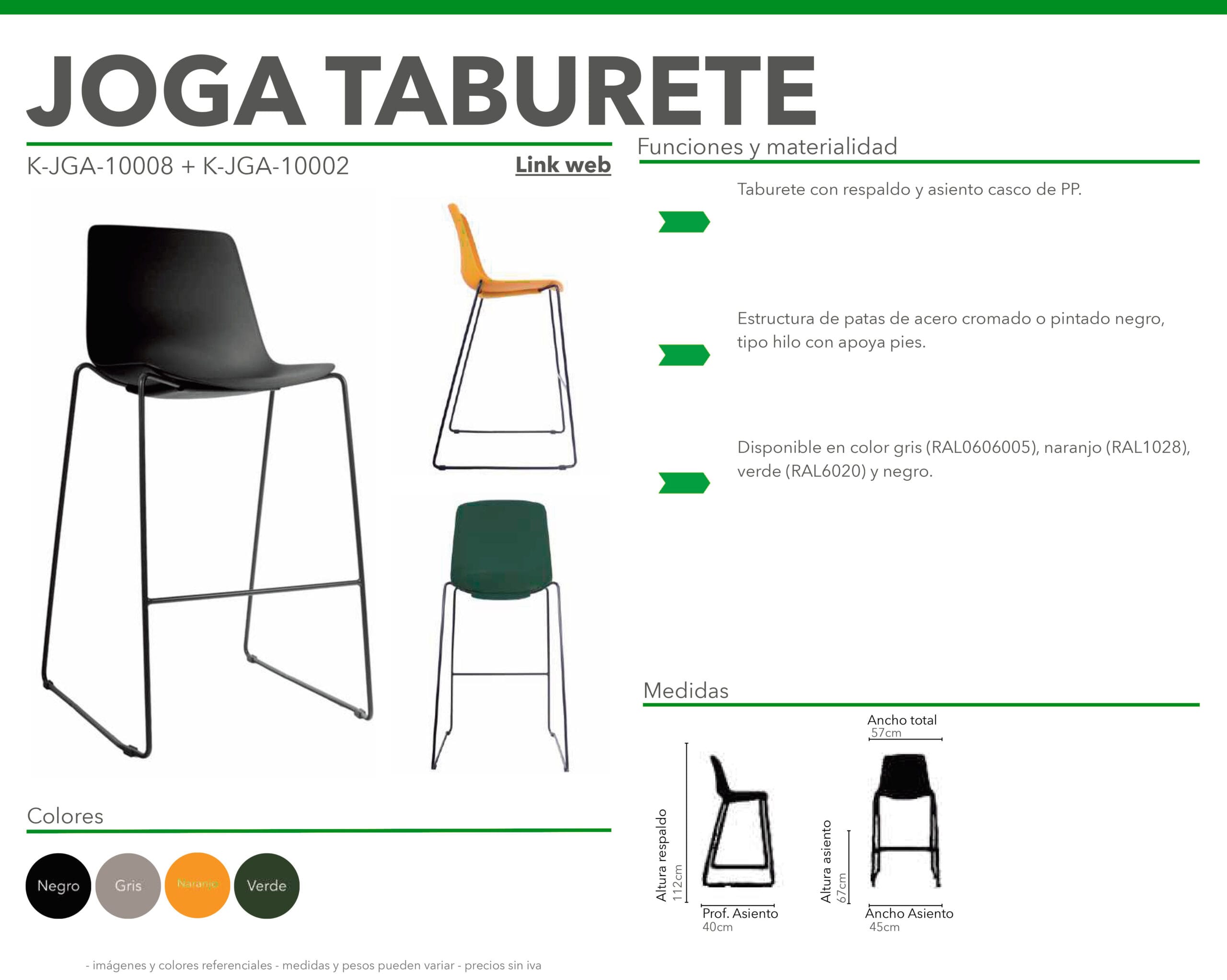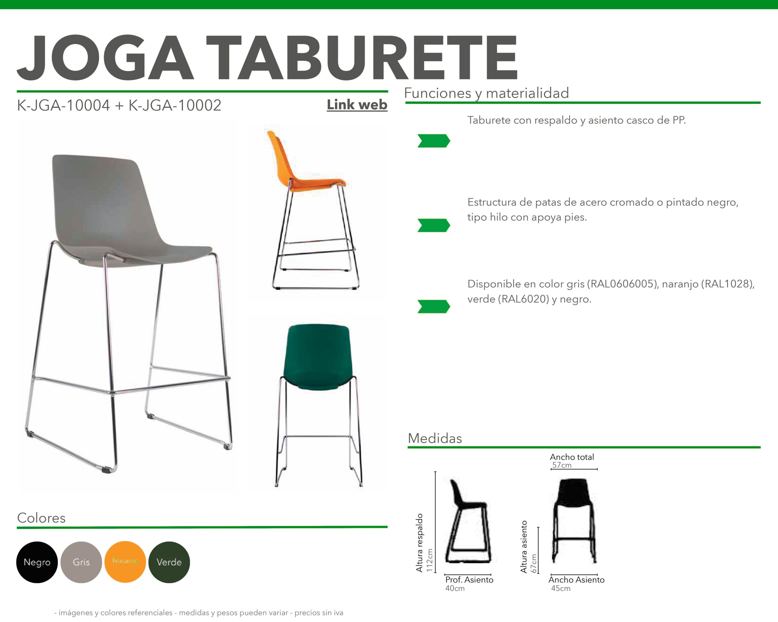Taburete con respaldo y asiento casco de PP. El asiento tiene 45 cm de ancho y 43 cm de profundidad, el respaldo, 45 cm de ancho y 40 cm de alto.